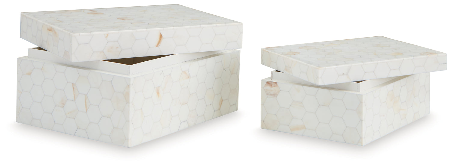 Looking for a casually cool home accent? This set of boxes stacks up beautifully. A hexagonal mosaic design and cream finish bring a laid-back element to your decor. What a stylishly effortless way to refresh your shelves and tabletops.
