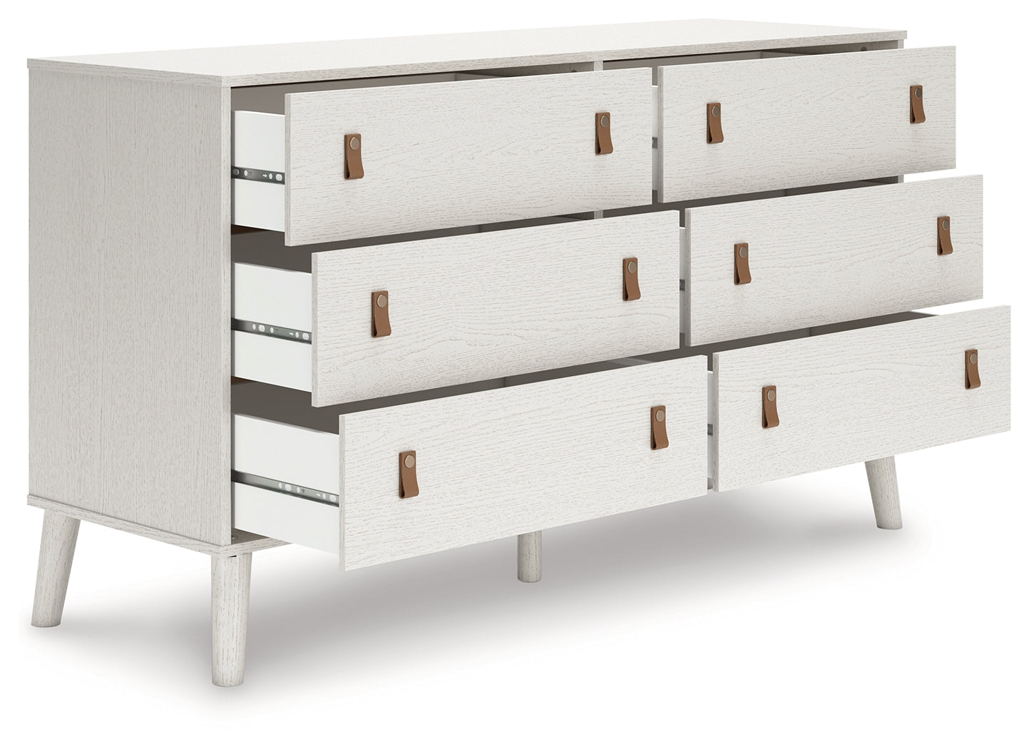 Dare to take minimalism to the max. This bedroom package has an air of sleek simplicity thanks to its white painted finish with subtle replicated wood grain. Two sets of faux leather pulls in light brown and gray allow you to customize the drawers to suit your space.