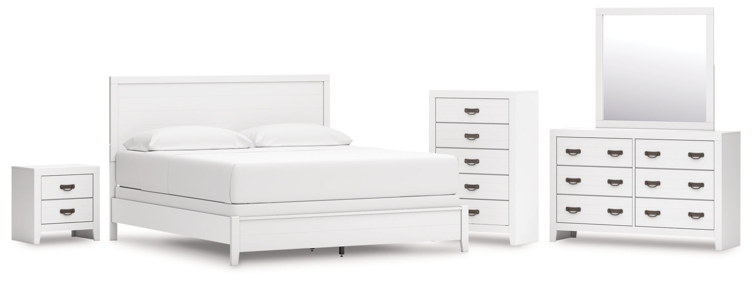 Binterglen 6-Piece California King Panel Bed with Mirrored Dresser, Chest and Nightstand (King/California King Panel Headboard/Footboard and Slats, California King Panel Rails, Dresser, Bedroom Mirror, Chest of Drawers, Nightstand)