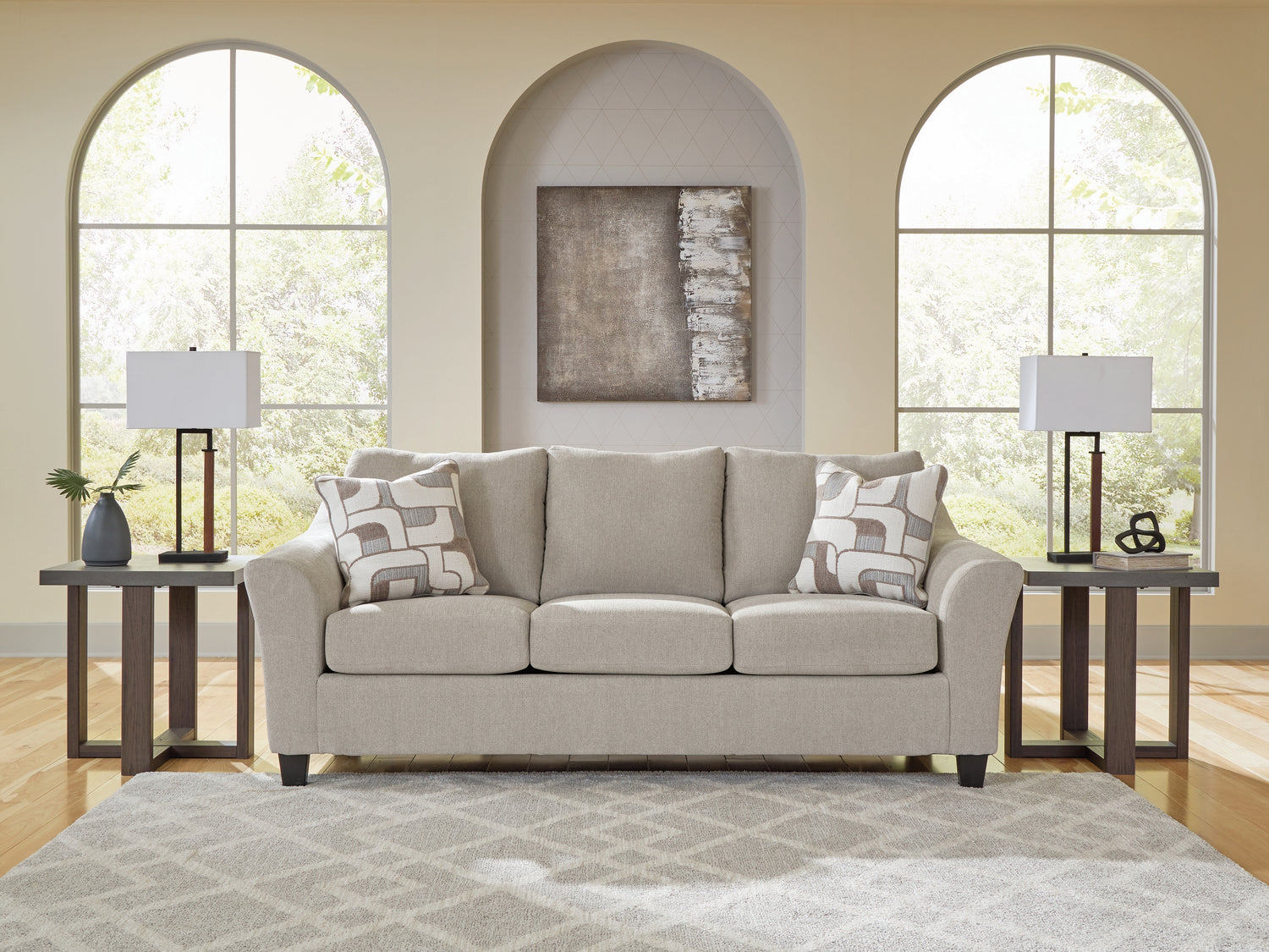 Subtle in color, big on style possibilities. This queen sleeper sofa is a transitional take on everyday comfort. Its soft-to-the-touch upholstery keeps you cozy as you lounge, and the neutral hue is a perfect canvas for adding your own fashionable flair. Hosting guests overnight? It's easy to transform this sofa into a sleeper with the built-in queen mattress.