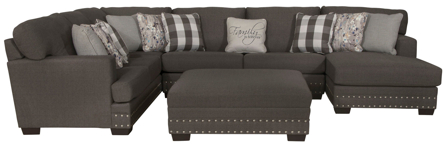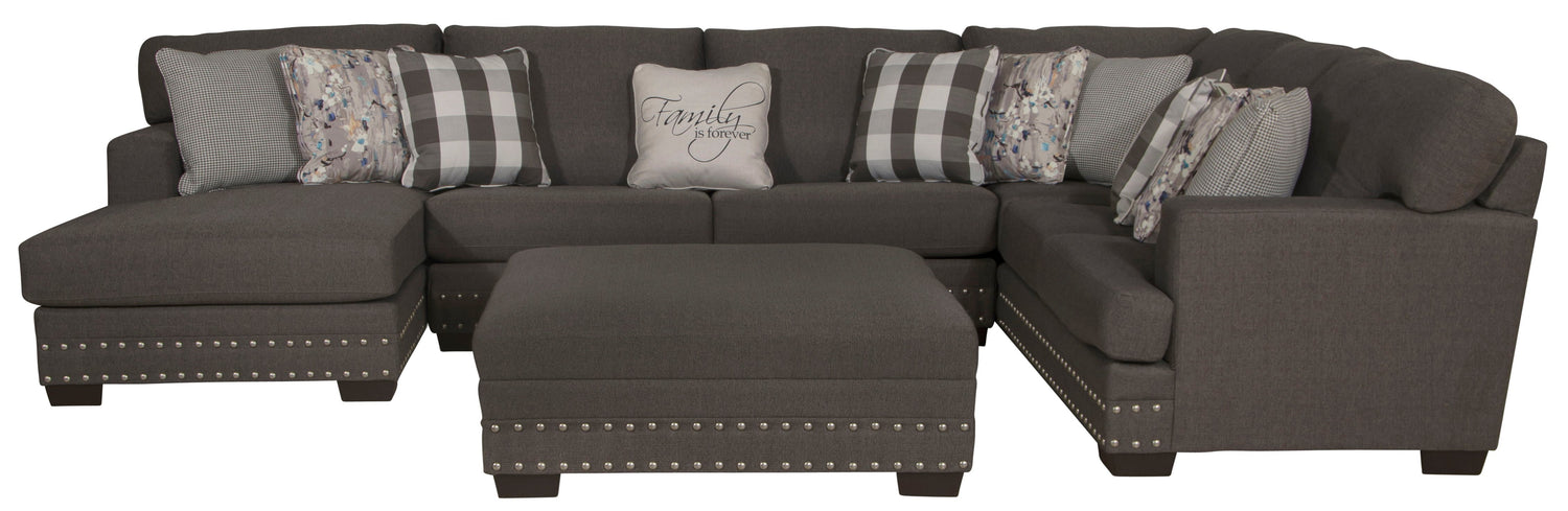 The contemporary farmhouse styling of the Crawford sectional brings comfort and style to any room. The seats are constructed of individually pocketed coils encased in foam and topped with a layer of cool gel infused memory foam for a long lasting, comfortable and supportive seat. Covered in a soft, gray, durable 100% polyester fabric the Crawford is durable enough for use in a family room, basement or bonus room. The exceptional styling shows through with the included decorator accent pillows and nickel nail head accents along the base rail.