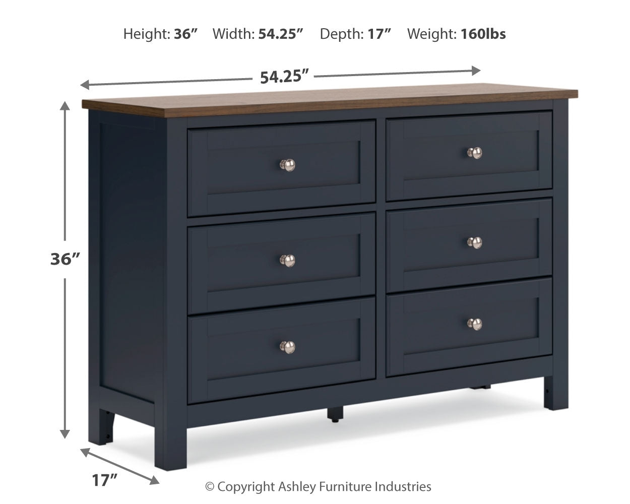 Add homespun charm to your restful retreat with this bedroom package. A modern take on timeless silhouettes, it pairs a dark slate blue finish with light brown tops. Drawer fronts and legs in a classic Shaker style bring an air of beautiful simplicity to the bedroom. Whether it's part of a charmingly curated guest suite or a casually carefree kids room, this set is a welcome addition.