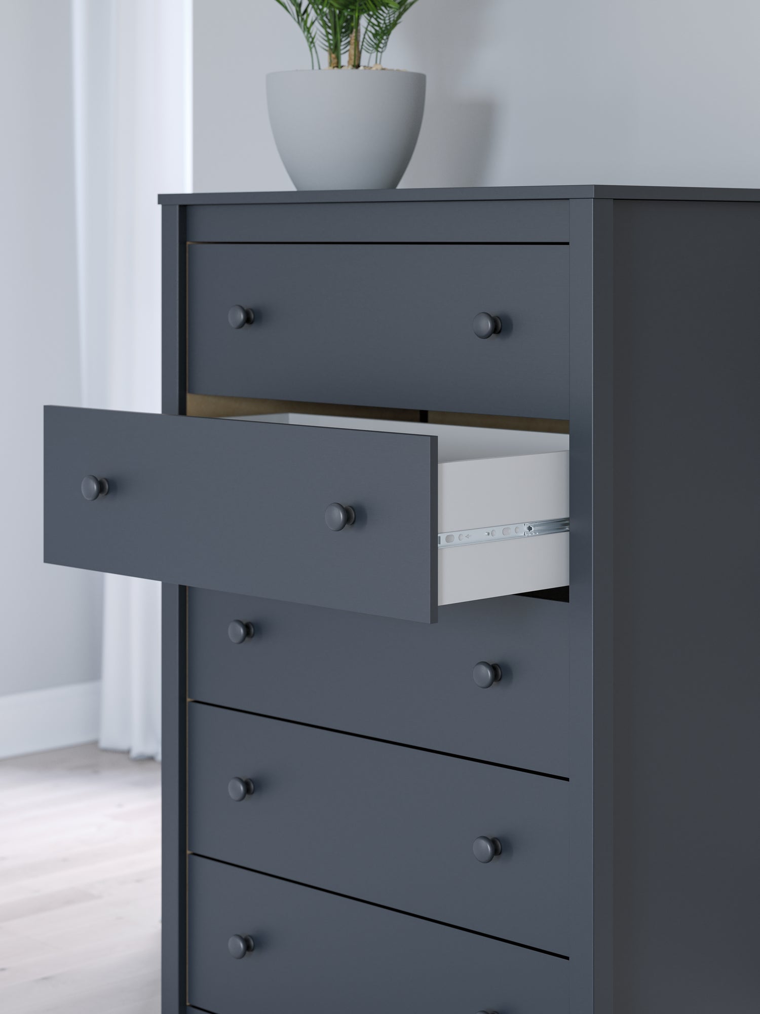 Immerse yourself in this collection, where Shaker-style design meets a stunning navy blue finish. The crisp lines effortlessly complement farmhouse, coastal and transitional decor. Sleek in its simplicity, this set suits your desire for a fresh bedroom style with essential function.