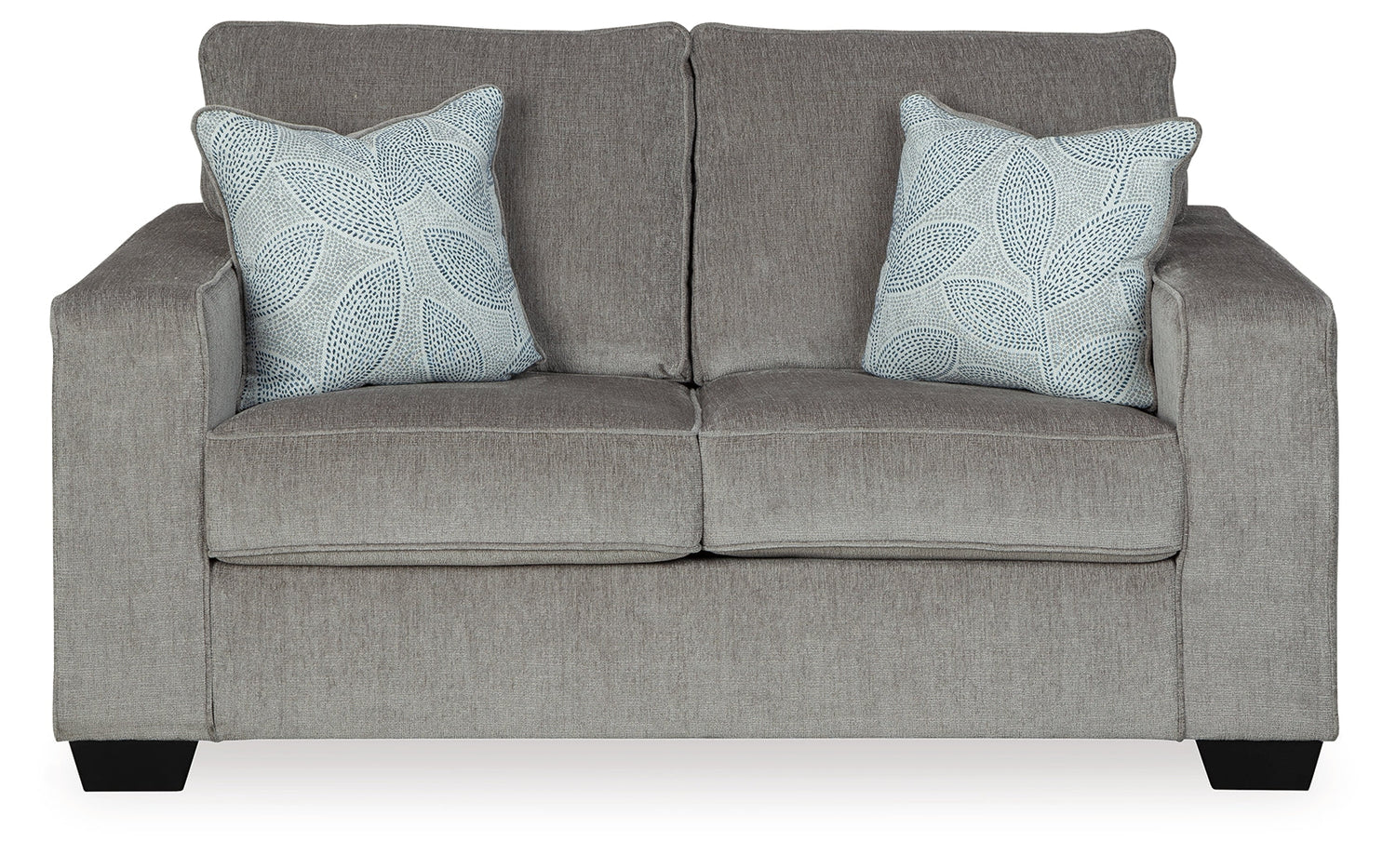 If style is the question, then this sectional with matching loveseat and ottoman is the answer. Sporting clean lines and sleek track arms, the decidedly contemporary profile is enhanced with plump cushioning and a chenille-feel upholstery, so pleasing to the touch. Sure to play well with so many color schemes, this sectional in richly neutral alloy includes a pair of understated floral pattern pillows for fashionably fresh appeal.
