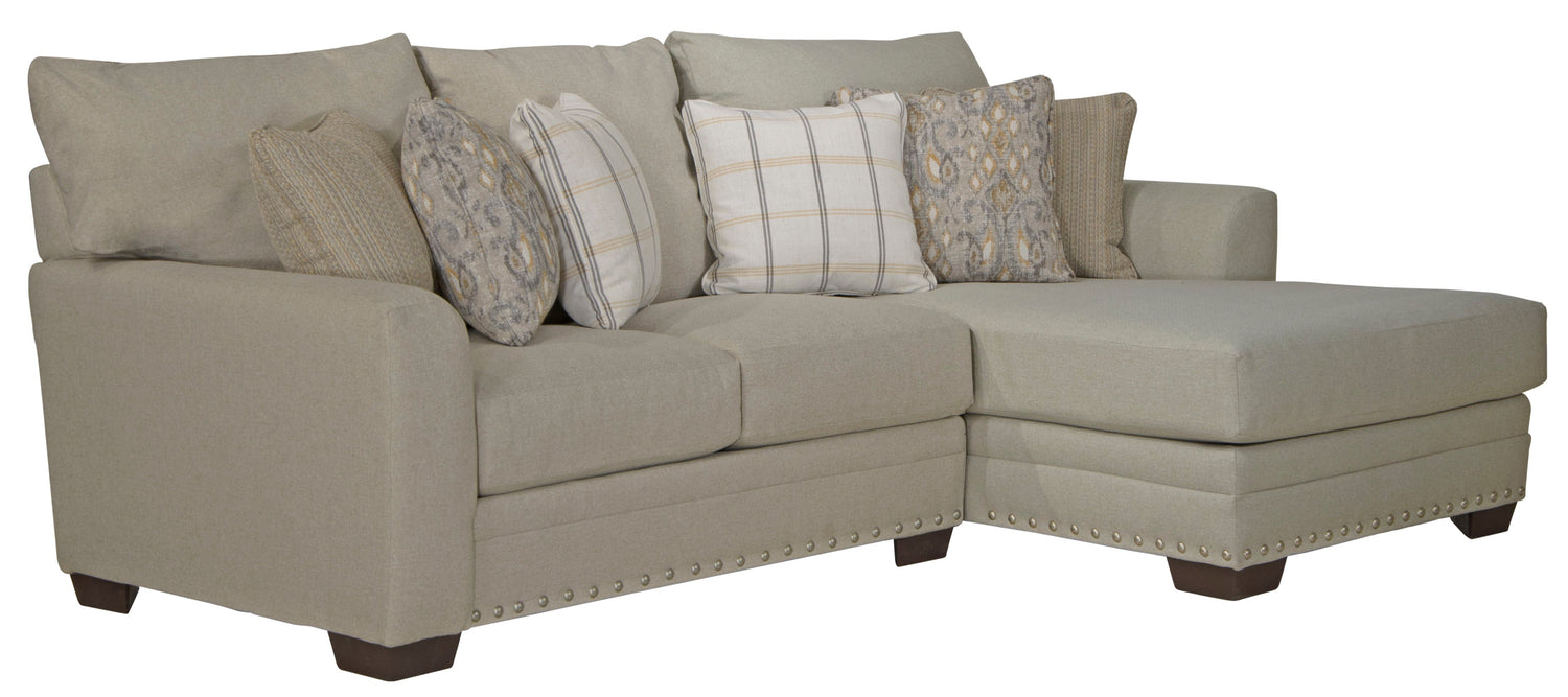 The contemporary farmhouse styling of the Middleton sectional brings comfort and style to any room. The seats are constructed of individually pocketed coils encased in foam and topped with a layer of cool gel infused memory foam for a long lasting, comfortable and supportive seat. Covered in a soft, durable 100% polyester fabric in a light gray color the Middleton is durable enough for use in a family room, basement or bonus room. The exceptional styling shows through with the included decorator accent pillows and nickel nail head accents along the base rail.