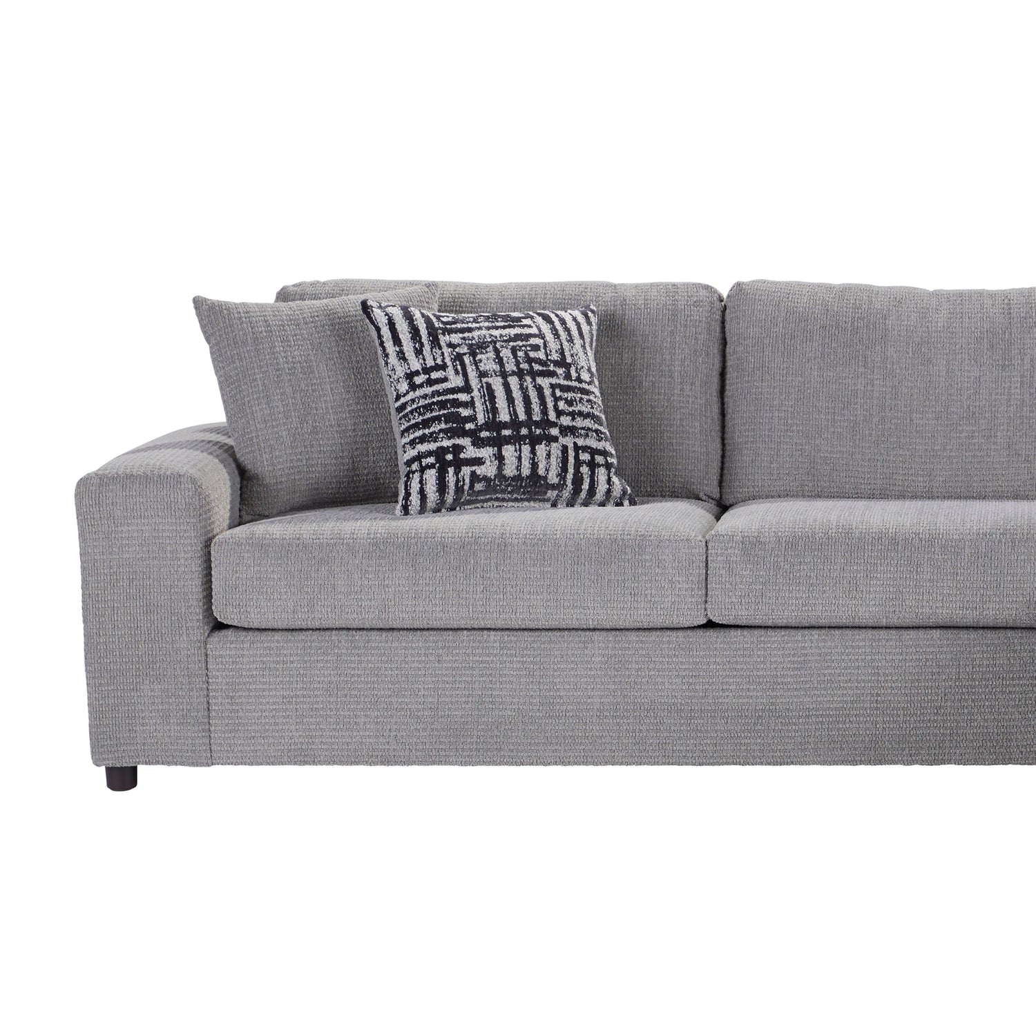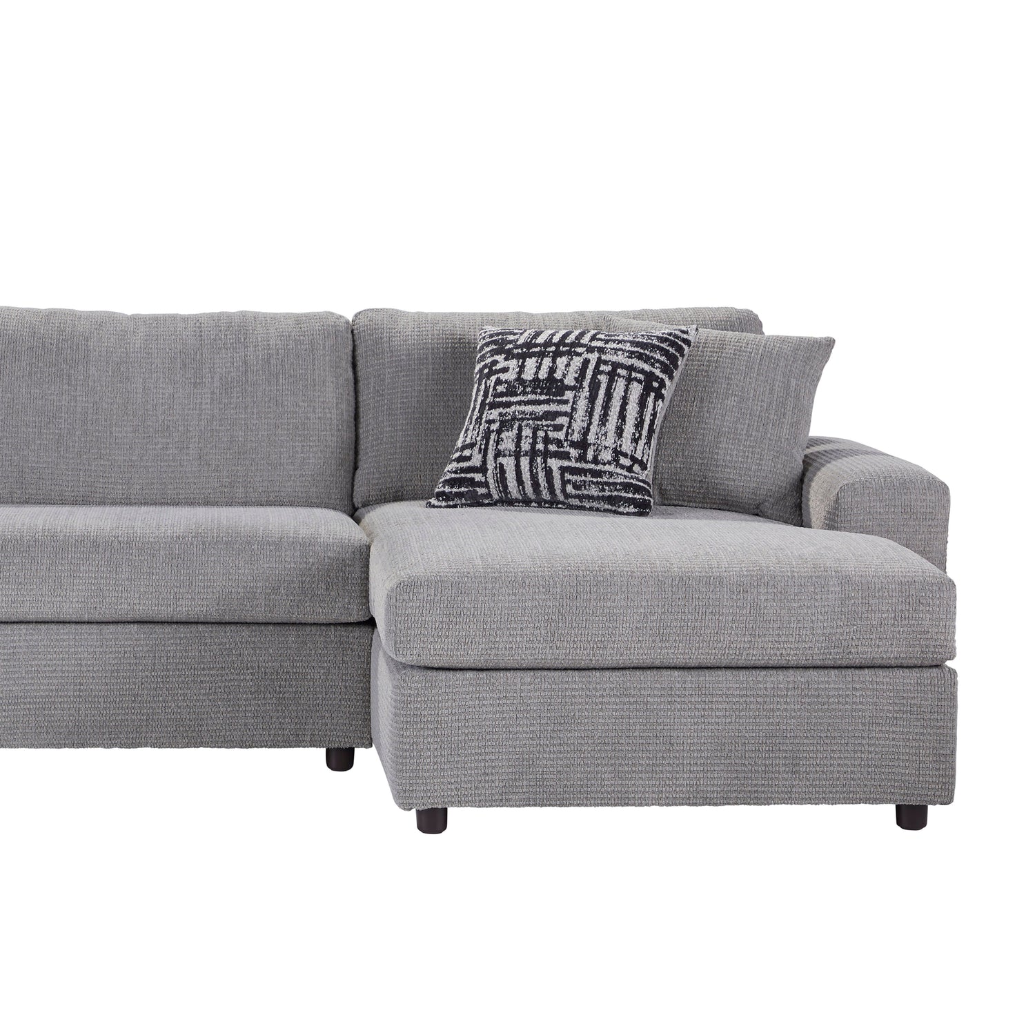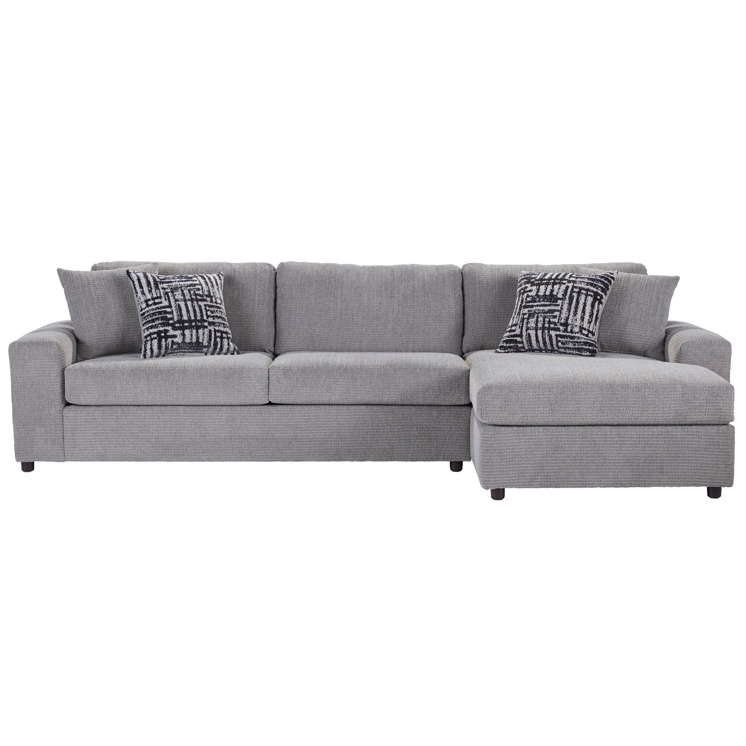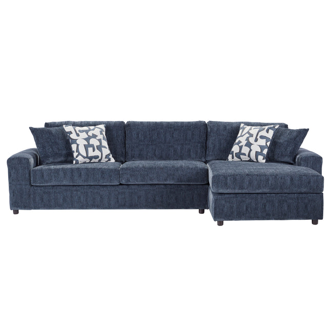 Introducing the Tristan Chaise Sectional, where comfort meets style in this meticulously crafted seating ensemble made in the USA. Versatile and spacious, this sectional combines a chaise lounge and matching loveseat, accommodating up to six guests effortlessly. Enjoy the plush comfort of attached pillow back cushions filled with foam, complemented by the sleek design of square arms for an added touch of elegance. Engineered for longevity, the sectional features solid and manufactured wood frames fortified with reinforcing corner blocks and sinuous springs, promising enduring durability and support. Adorned in 100% polyester fabric, with four coordinating accent pillows, the Tristan Sectional effortlessly infuses any space with a sense of understated sophistication.
