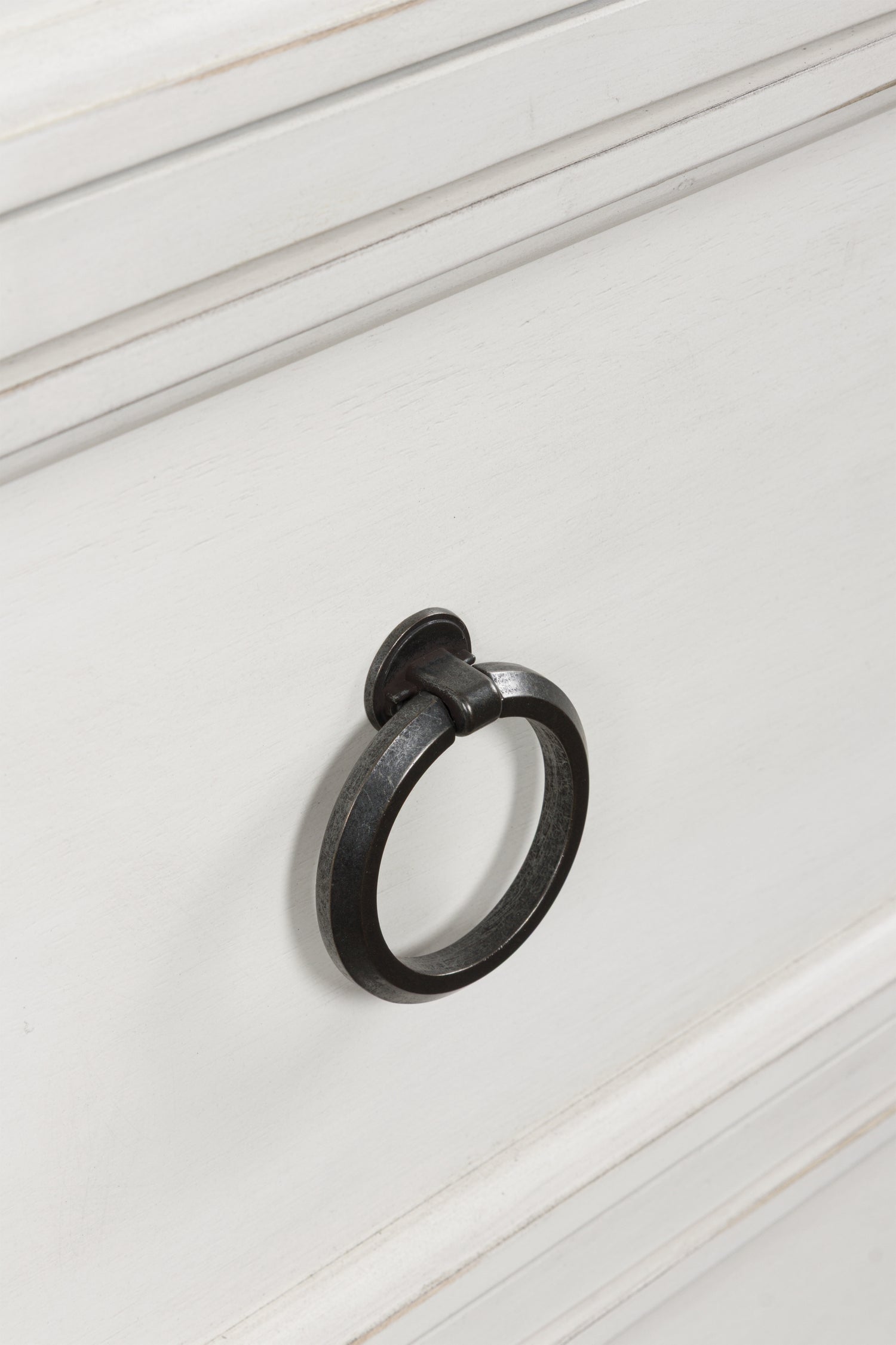 Taking a laid-back approach to casual traditional design, this artfully crafted chest of drawers combines classic elements with a clean modern approach. Its rubbed antiqued white finish exudes a comfy, timeless appeal that's sure to carry you away to a dreamy time and place. Simple round metal knobs and ring pulls on the chest's spacious drawers make just the right statement.