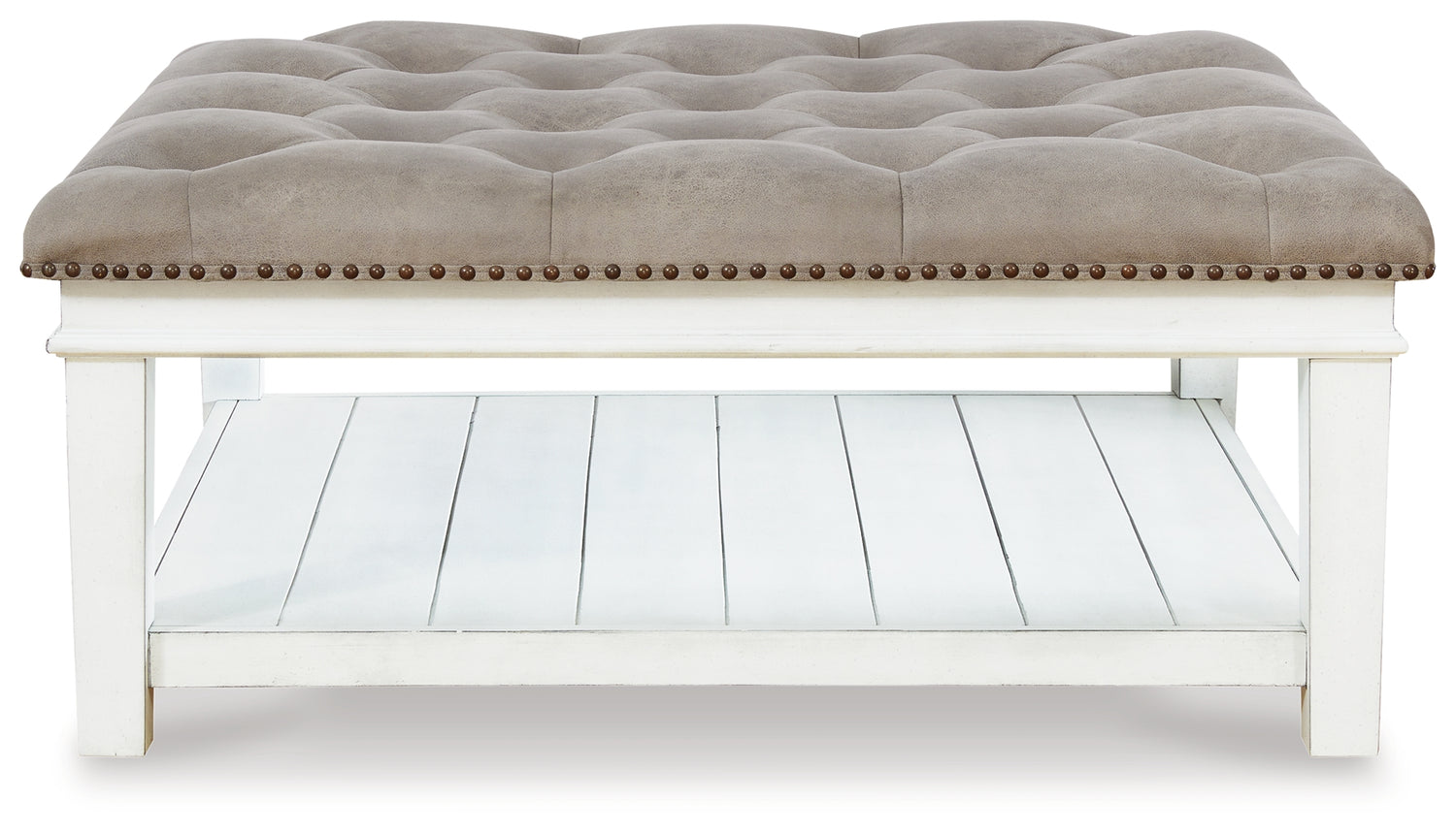 Ideal as a footrest or coffee table stand-in, this ottoman coffee table adds an all-purpose farmhouse touch to your living space. Crafted with comfort and convenience in mind, this square ottoman features a faux leather button tufted seat with nailhead accents. Enhancing its casual appeal, a handy lower shelf houses throws, reading material and other essentials.