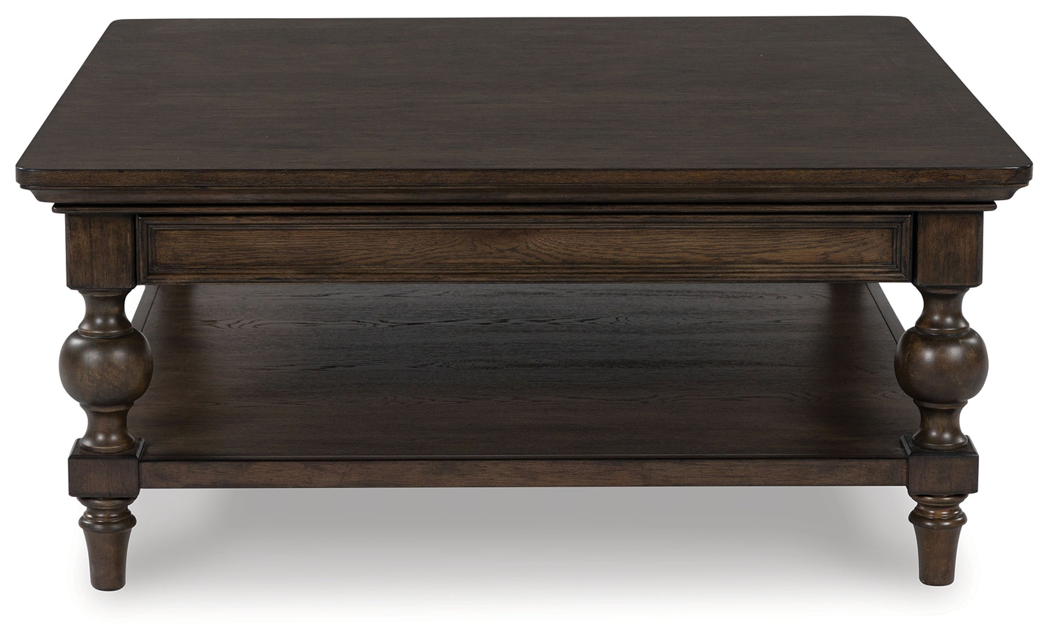 For those who appreciate a time-honored aesthetic with understated elegance, this coffee table brings home a timeless look. Its rich brown walnut finish merges seamlessly with a profiled top and traditional baluster turned legs for a richly classic appeal. And did we mention the spacious lower shelf to display your whatnots?