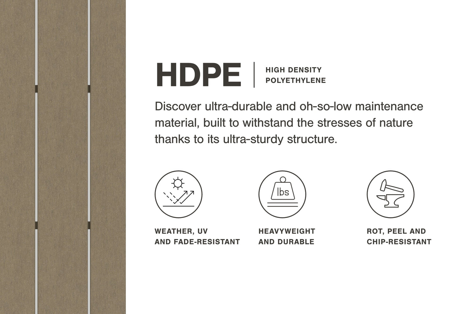 It’s the dawn of a new day for gray. Embrace the style trend with this outdoor conversation set. Each piece is crafted of HDPE material, combining the exceptional durability and weather resistance you need with the "wood look" you love. The coffee table and comfortably cushioned seats take alfresco living to a whole new level. A slatted table top infuses a plank-style, farmhouse-inspired touch and naturally sheds rainwater. Rest assured, the thick cushions on the sofa and lounge chairs are wrapped in Nuvella® high-performance fabric that’s fade-resistant, stain-resistant and a breeze to keep clean.