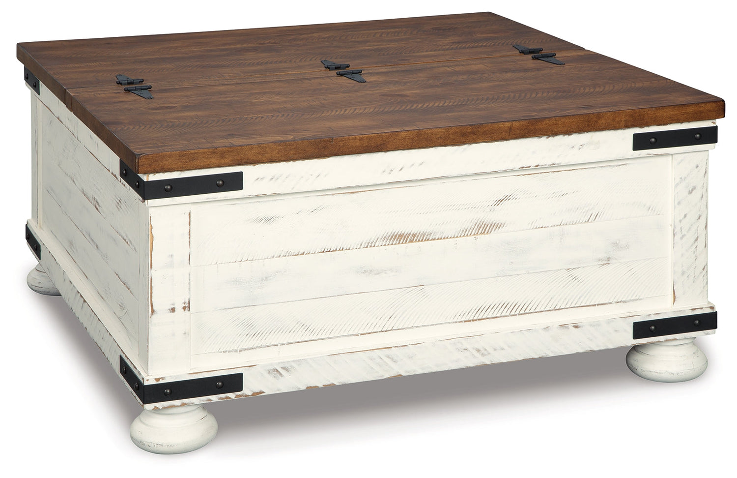 Double take. Sporting a two-tone finish, dual-sided lid design and expansive storage space, this square coffee table and 2 end tables takes the art of rustic farmhouse living to a new level. Designer touches include plank-effect styling, heavy distressing and industrial bracket hardware.
