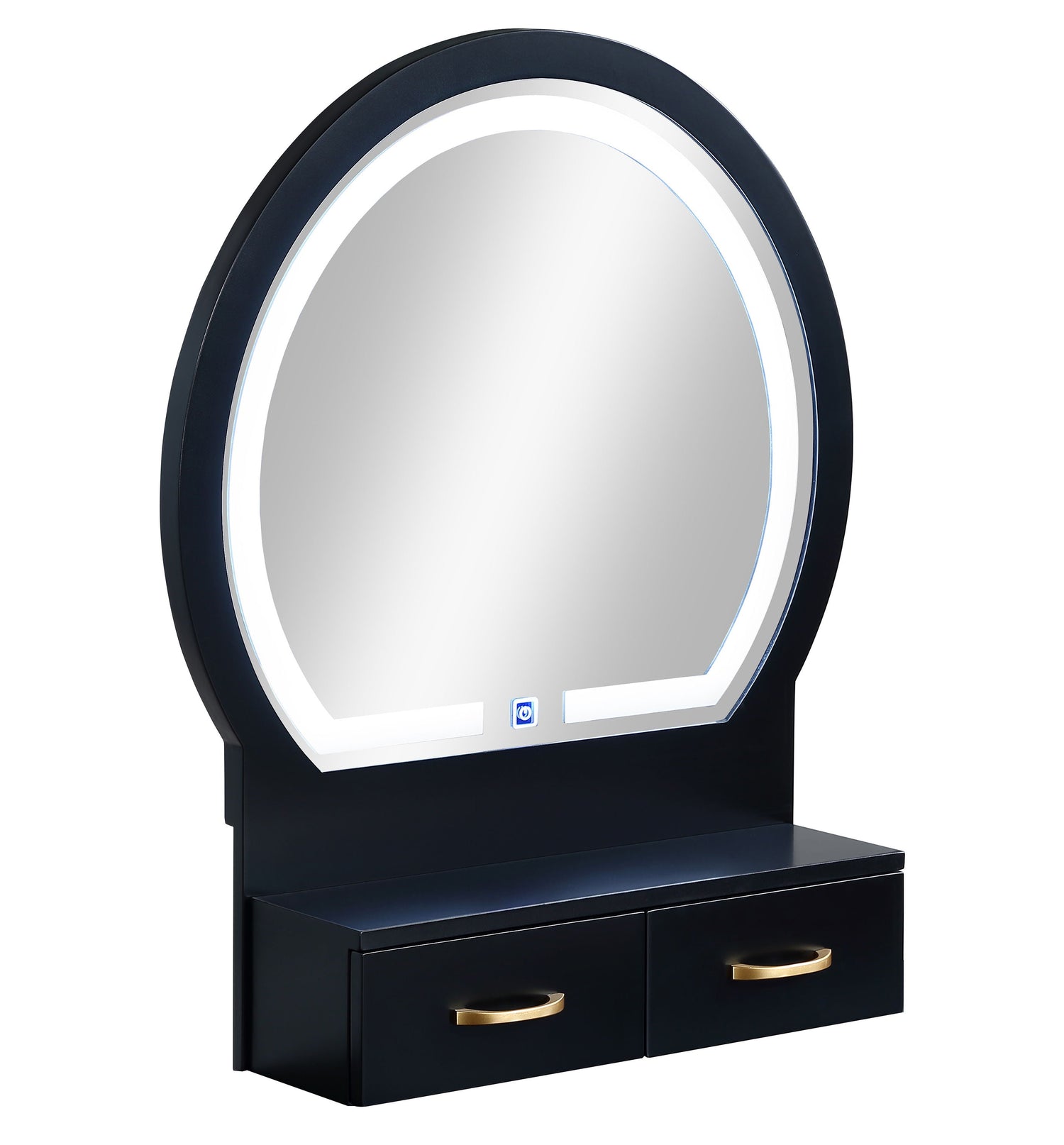 Create a chic and functional centerpiece for your bedroom or dressing area with this elegant vanity set. The sleek, finish exudes modern sophistication, while the accented handles add a touch of luxury. The built-in LED-lit mirror provides optimal lighting for flawless makeup application or grooming, creating a glamorous and practical space. With spacious drawers and an upper shelf, it offers ample storage to keep your beauty essentials organized and within easy reach. The matching cushioned stool ensures comfort and style, perfectly complementing the overall design. This set combines functionality with aesthetic appeal, making it the ultimate addition to any stylish home.