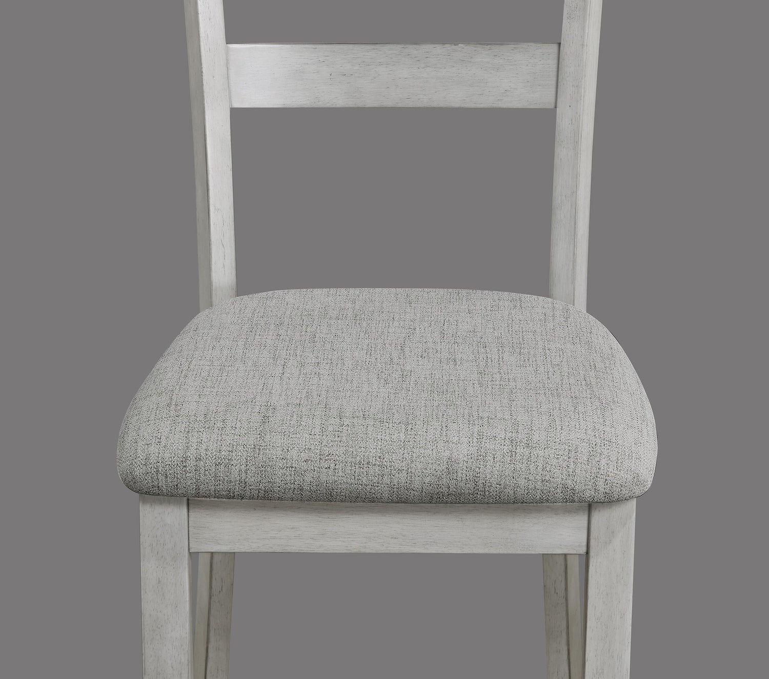 Presenting a fresh take on contemporary comfort. This dining set effortlessly combines a rustic washed finish with modern clean lines, creating a timeless appeal. The tabletop showcases a serene, neutral hue complemented by the gentle curve of the chair backs and soft upholstered seats. Delicate details like the ladder-back design give a nod to traditional craftsmanship while maintaining a current feel.