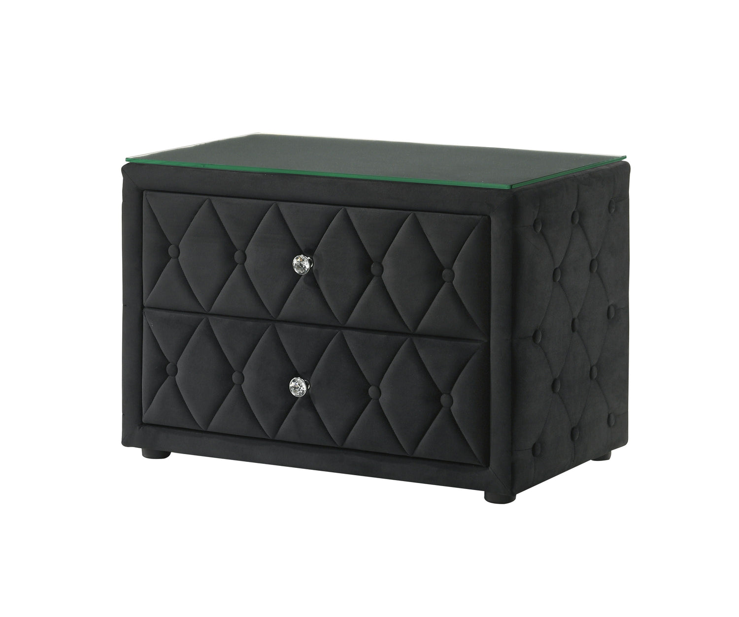 This stunning nightstand exudes modern sophistication with its luxurious velvet upholstery and elegant diamond-tufted design. The two spacious drawers provide ample storage, while the crystal-like drawer pulls add a touch of glamour. The sleek glass top enhances its chic appearance, offering a durable and stylish surface for your bedside essentials. Perfect for those looking to elevate their bedroom décor, this nightstand combines functionality with a bold statement piece, making it a must-have for any contemporary space.