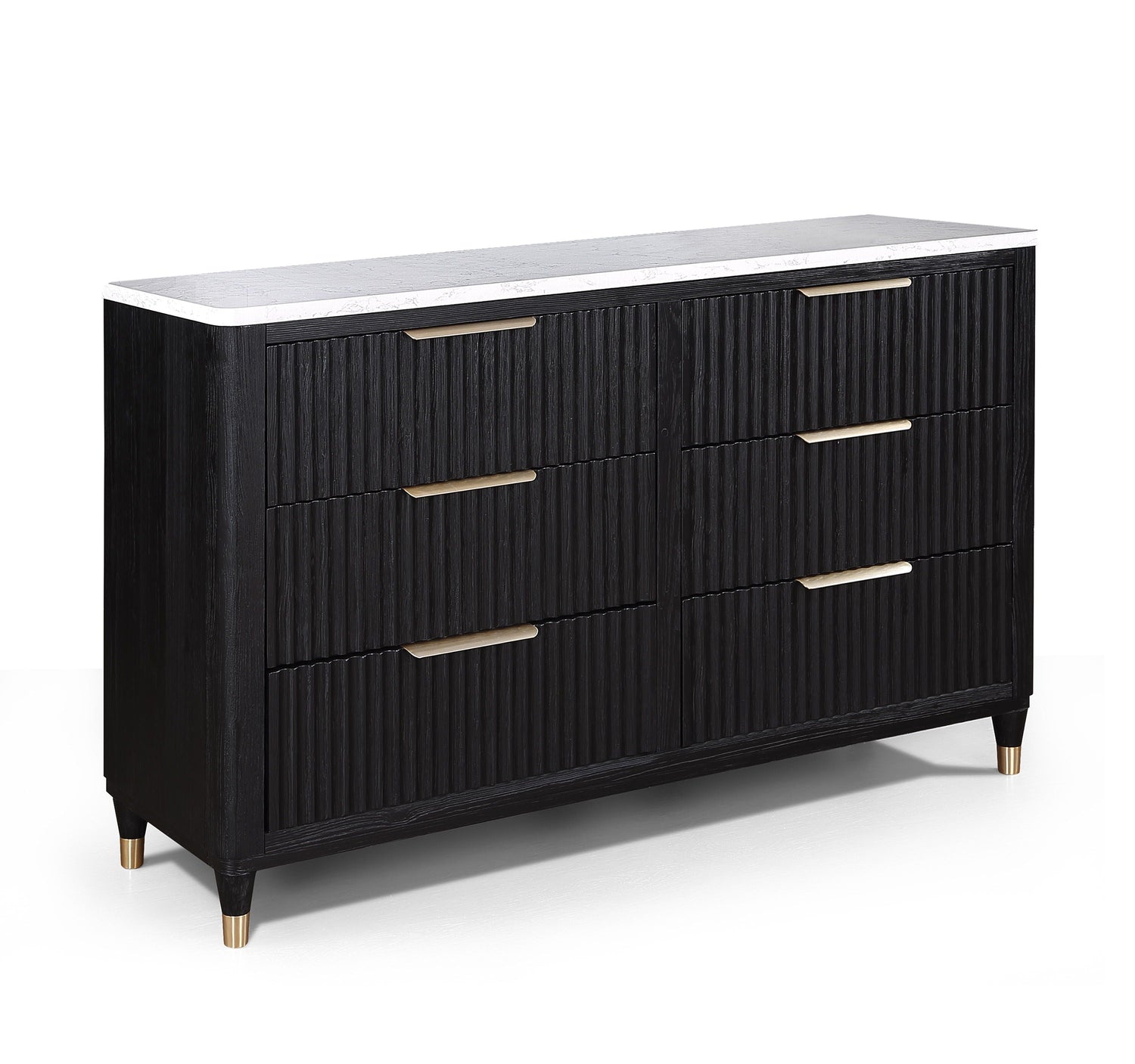 Elevate your sanctuary with this chic and contemporary bedroom ensemble that blends functionality with a sleek, modern aesthetic. The collection features a luxuriously upholstered bed, showcasing a high headboard and footboard with a refined fabric selection that exudes comfort and sophistication. Accompanying the statement bed are matching pieces, including a streamlined dresser, nightstand and chest, each sporting a minimalist design with crisp engineered stone tops and bold, brass-accented hardware.
