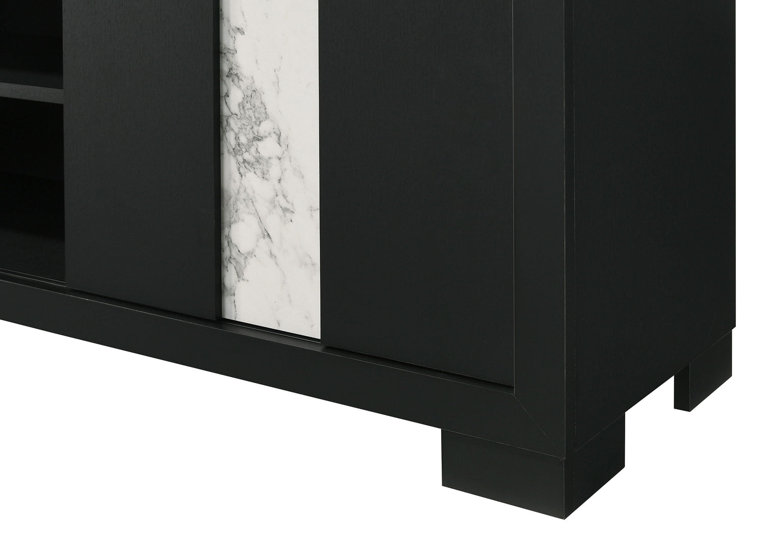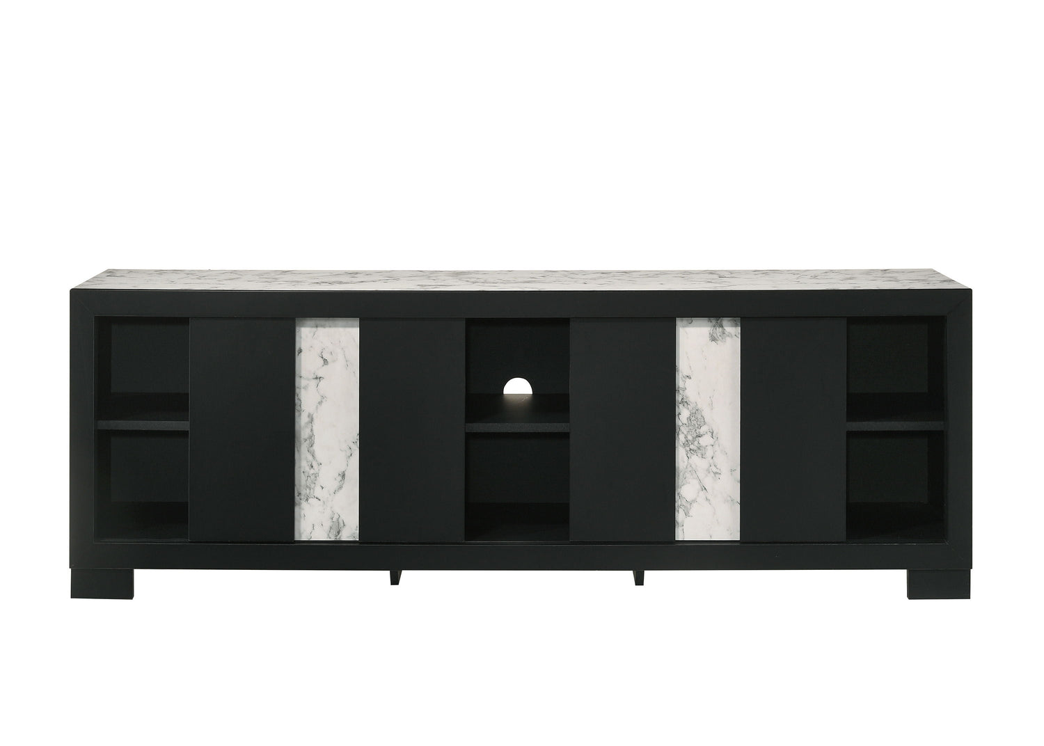 This sleek and modern entertainment unit is the epitome of contemporary elegance and functional design. Boasting a bold finish with striking marble-like accents, this piece serves as a captivating centerpiece for any living space. Its generous surface perfectly accommodates large screen displays, while the ample storage space including open shelving and discreet cabinets provides a neat solution for all your multimedia devices.