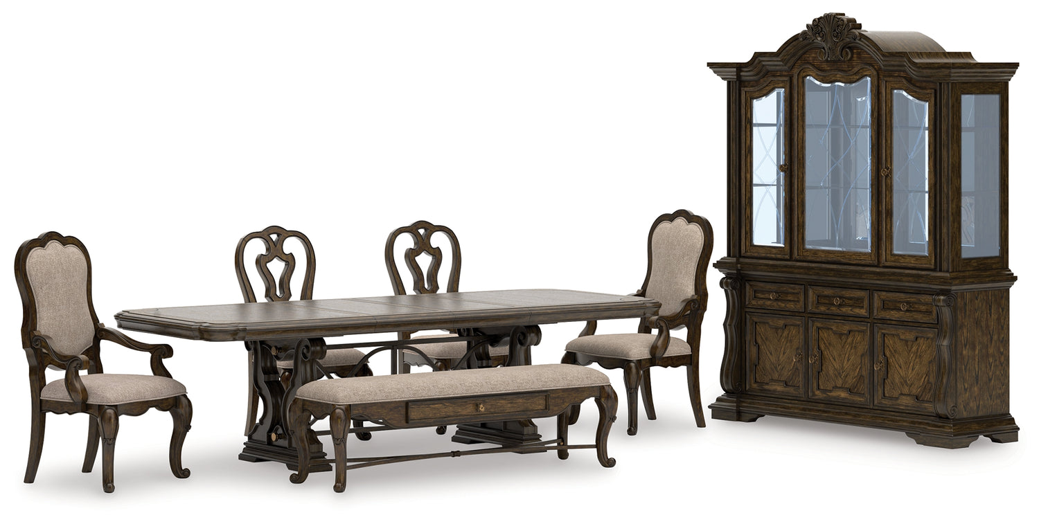 From its ornamental appliques to its large scale, this dining package makes a bold statement. With ornate details, the opulent set wows with stunning style. The look is timeless. The feel? Right at home.