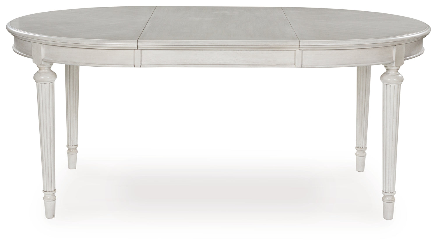 Transform your home into a haven of timeless elegance with this dining extension table. Traditionally styled, its classic antiqued white finish is paired with reeded legs and a tabletop with a butterfly-matched veneer pattern. With the removable center leaf, it effortlessly transitions from round to oval to seat six comfortably. Whether you're settling in at mealtime or working from home, this table serves your sense of relaxed refinement beautifully.