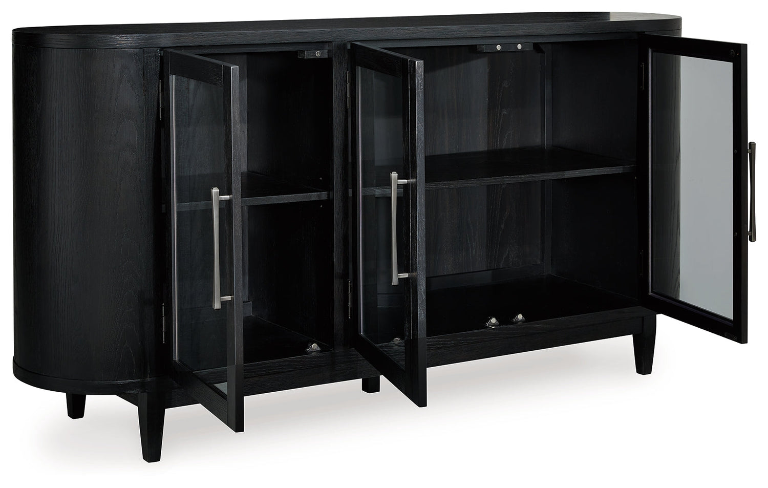 Inspired by art deco design, this dining package makes a lasting impression in a simply stunning way. Magnificent curved silhouettes are enhanced with a rich layered black finish and neutral upholstery. This set makes the contemporary statement you’ve been seeking to elevate late-night dinners and full-on family feasts.