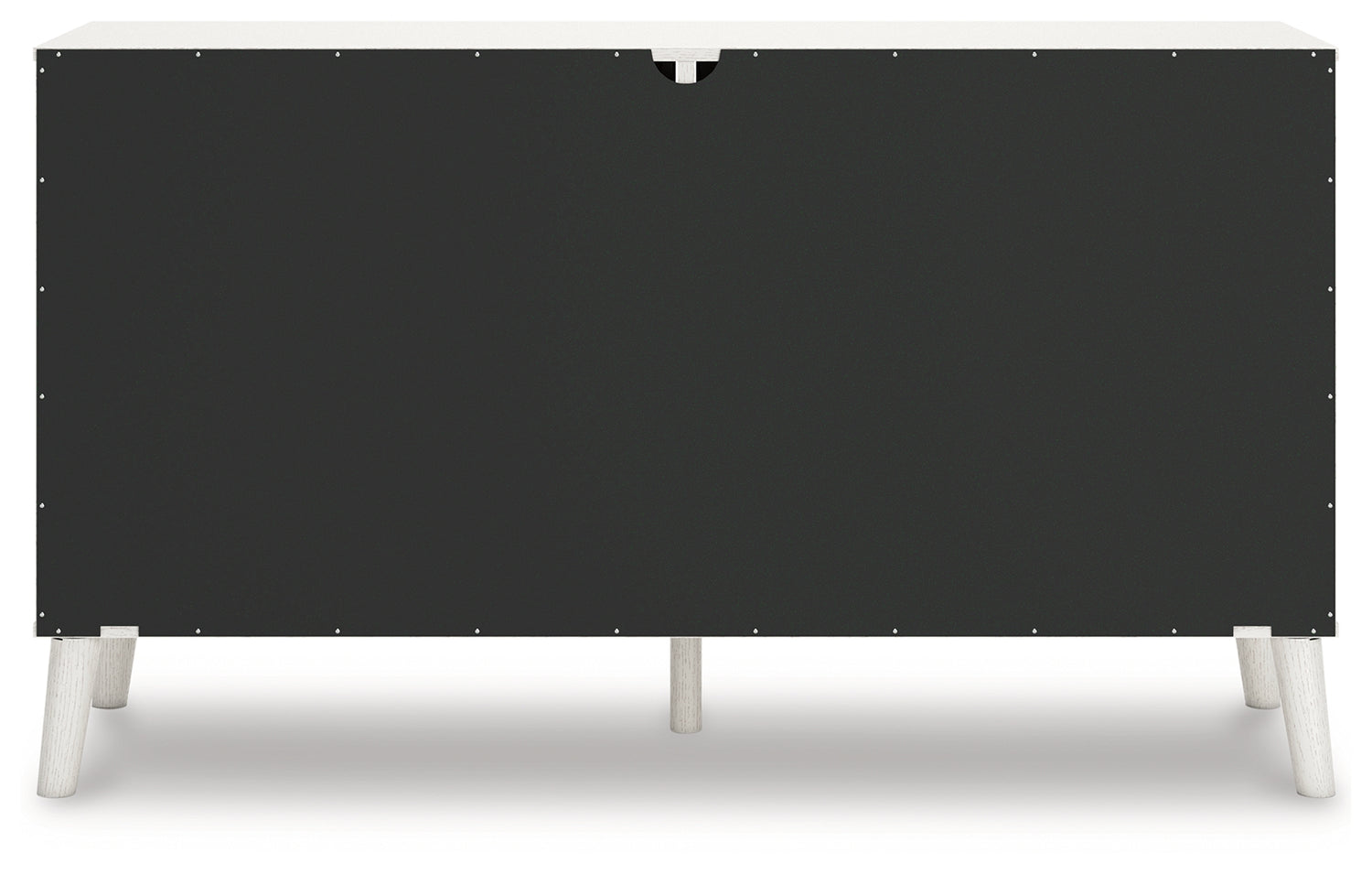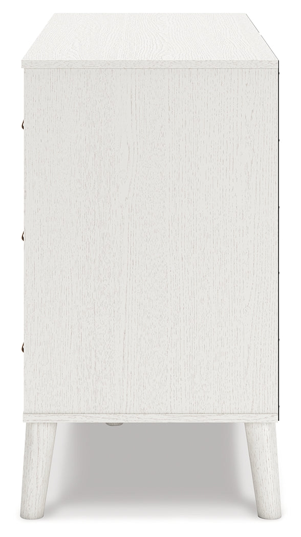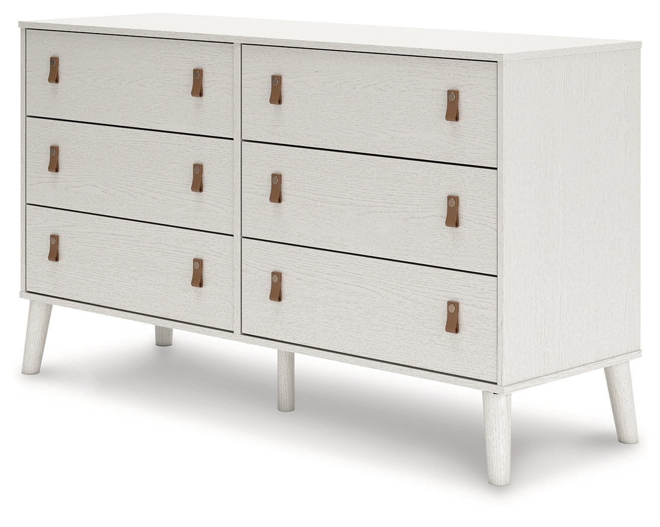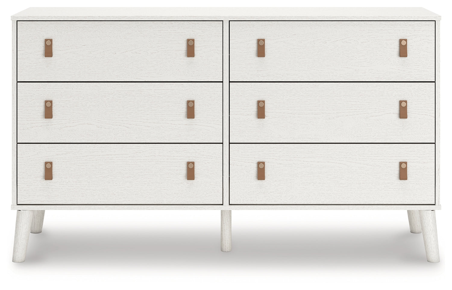 Dare to take minimalism to the max. This dresser has an air of sleek simplicity thanks to its white painted finish with subtle replicated wood grain. The magnificently mod splay legs are a compelling complement to its streamlined design. And with two sets of faux leather drawer pulls that allow you to customize the dresser to suit your space, there's no doubt about it: This contemporary piece is sure to become a classic.