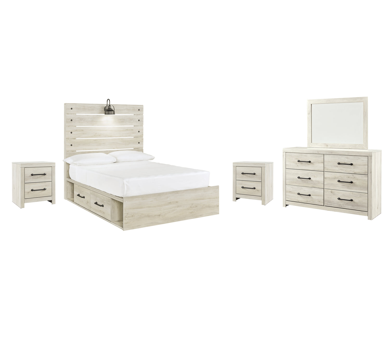 Whether you lean towards modern loft or modern farmhouse, this panel storage bed, two nightstands, and dresser with mirror tip the balance in your favor. The wispy whitewash finish enhances the style without covering the grain for that weathered look you just can’t get enough of. Love to read in bed? You’re sure to find the retro-chic light sconce and USB plug-ins on the open-slat style headboard to be a totally bright idea, while the elongated metal drawer pulls really elevate the aesthetic. What a delightful take on rustic industrial style.