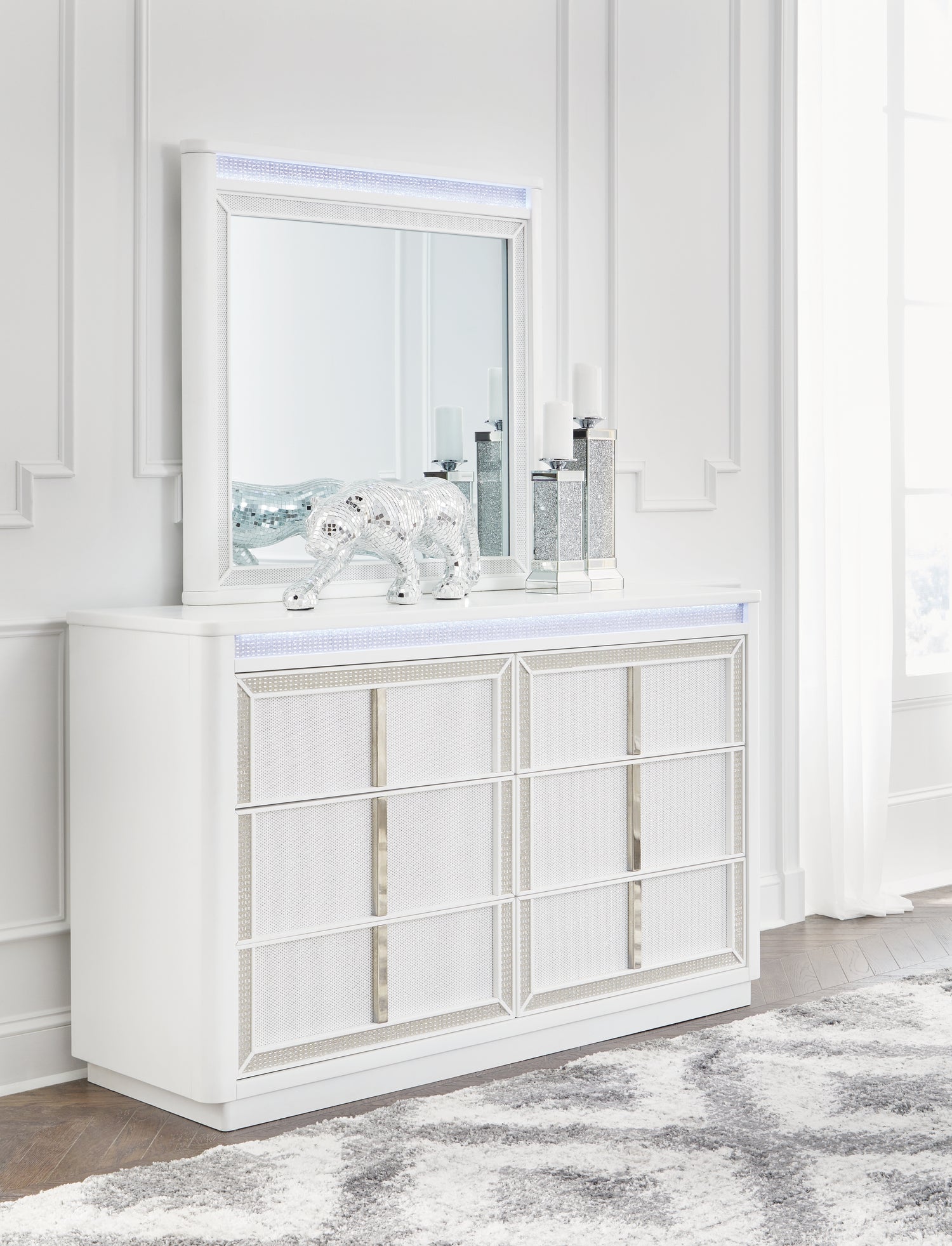 Transform your bedroom with this package. Its modern design and glamorous details create a sophisticated retreat. The set’s built-in LED lighting and rhinestone framing exude modern glamour. Let your sanctuary shine—and never let anyone dull your sparkle.