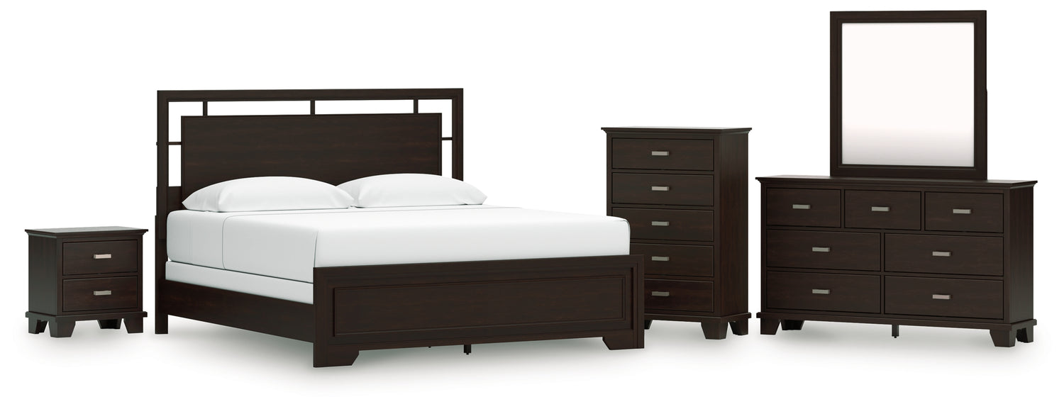 Covetown 6-Piece King Panel Bed with Mirrored Dresser, Chest and Nightstand (King/California King Panel Headboard/Footboard and Slats, Queen/King Panel Rails, Dresser, Bedroom Mirror, Chest of Drawers, Nightstand)