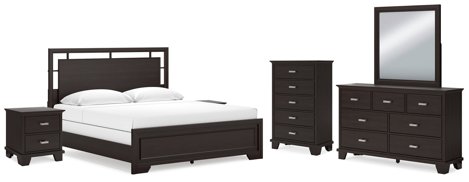 Covetown 7-Piece King Panel Bed with Mirrored Dresser, Chest and 2 Nightstands (King/California King Panel Headboard/Footboard and Slats, Queen/King Panel Rails, Dresser, Bedroom Mirror, Chest of Drawers, Nightstand, Nightstand)