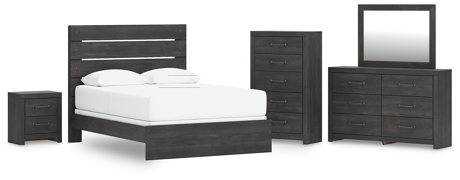 Hollivern 6-Piece Queen Panel Bed with Mirrored Dresser, Chest and Nightstand (Queen Panel Headboard/Footboard, Queen Panel Rails, Dresser, Bedroom Mirror, Chest of Drawers, Nightstand)