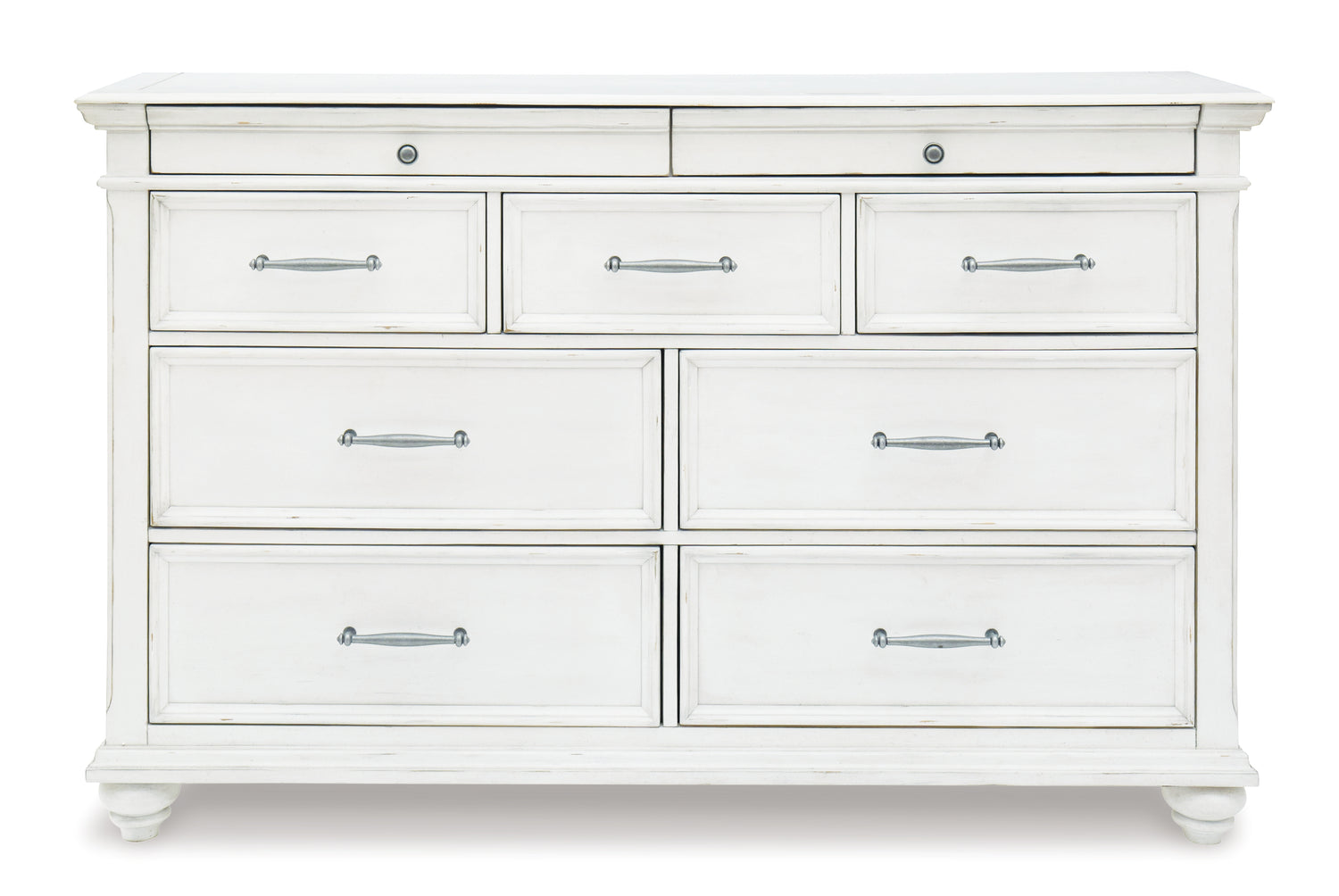 Give your retreat vintage charm with this bedroom set in a beautifully distressed whitewash finish. You'll love the headboard's grand style featuring a picture framed panel. The bench footboard is equally elegant offering extra storage and a convenient seat. Generously scaled moulding, framed drawer fronts and bun feet enhance the character of this bedroom set—evoking the feel of a quaint cottage escape.