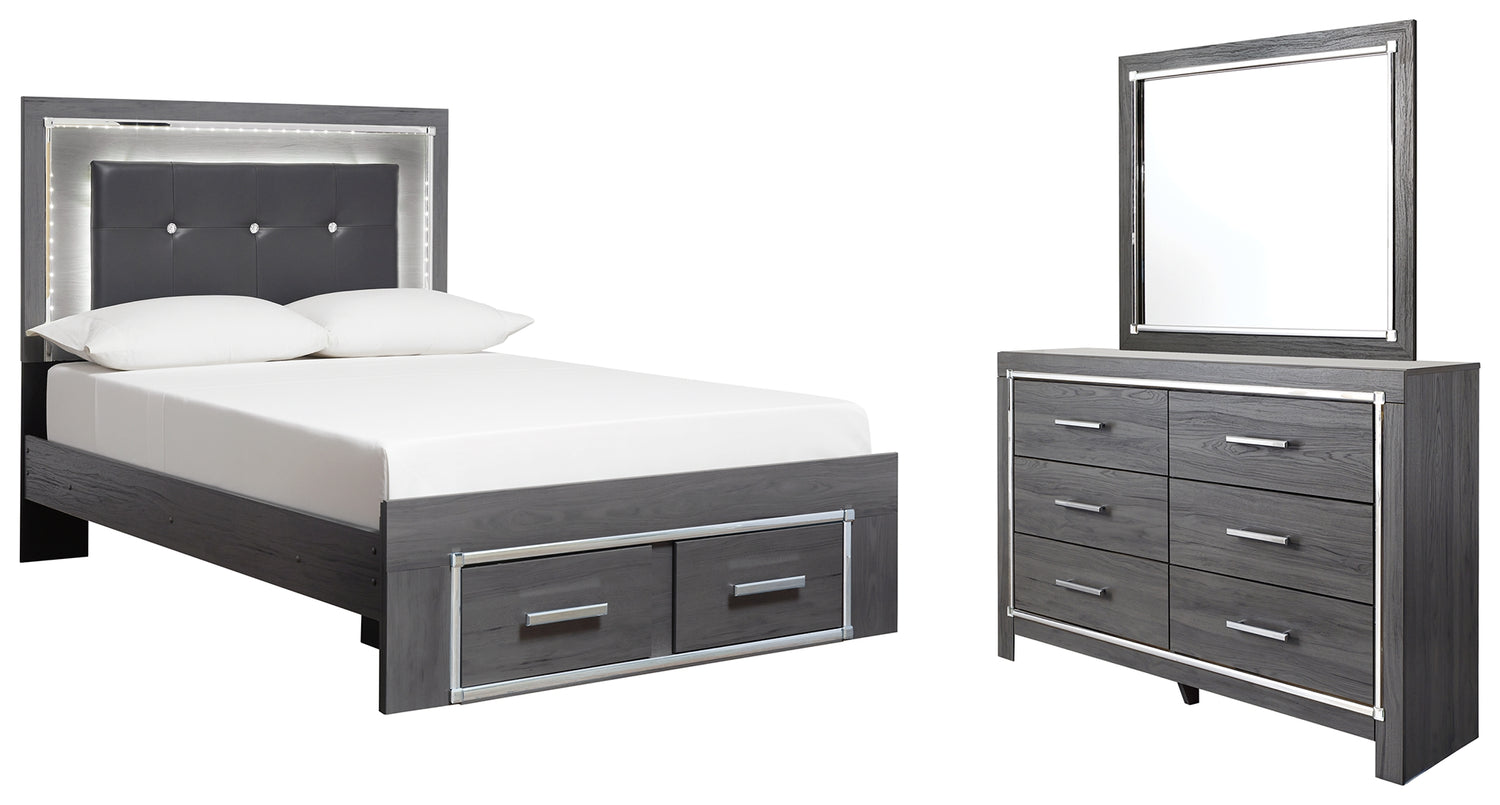 Lodanna 5-Piece Full Panel Bed with 2 Storage Drawers with Mirrored Dresser (Dresser, Bedroom Mirror, Full Storage Footboard, Full Panel Rails, Full Upholstered Panel Headboard)