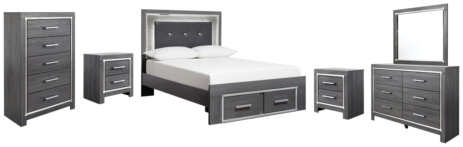 Lodanna 8-Piece Full Panel Bed with 2 Storage Drawers with Mirrored Dresser, Chest and 2 Nightstands (Chest of Drawers, Nightstand, Nightstand, Dresser, Bedroom Mirror, Full Storage Footboard, Full Panel Rails, Full Upholstered Panel Headboard)