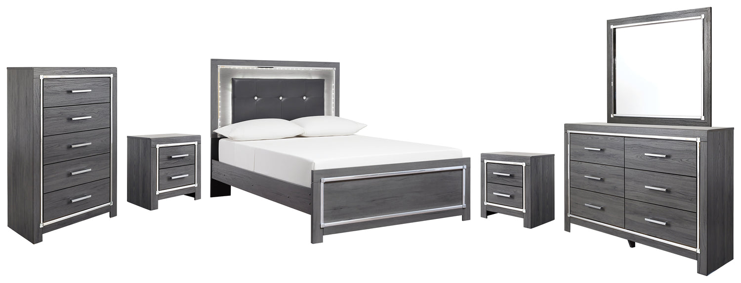 Lodanna 8-Piece Full Panel Bed with Mirrored Dresser, Chest and 2 Nightstands (Chest of Drawers, Nightstand, Nightstand, Dresser, Bedroom Mirror, Full Panel Footboard, Full Panel Rails, Full Upholstered Panel Headboard)