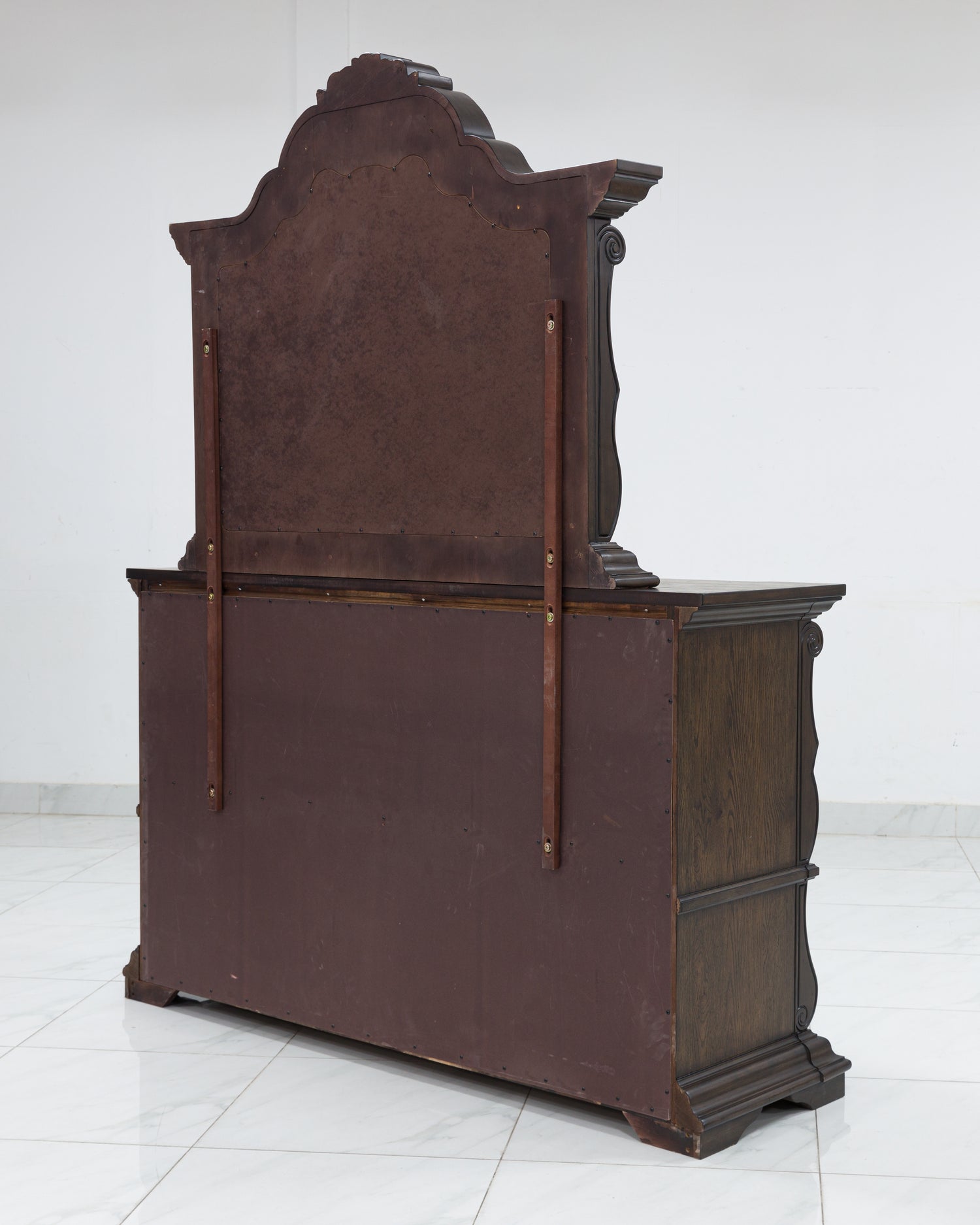 From its ornamental appliques to its large scale, this king upholstered bed makes a bold statement. Showcasing sculptural ornate details and button tufting, this opulent bed wows with stunning style. The look is timeless. The feel? Right at home. Matching dresser, mirror, chest and 2 nightstands included.