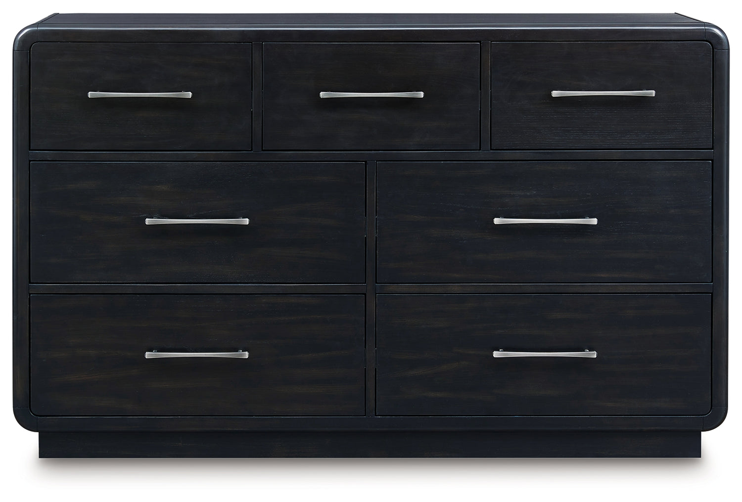 Inspired by art deco design, this softly shaped bedroom package makes a lasting impression in a simply stunning way. Magnificent curved silhouettes are enhanced by a rich layered black finish on the textured wood grain surface. These are the statement pieces you’ve been dreaming of to elevate your contemporary inner sanctum.