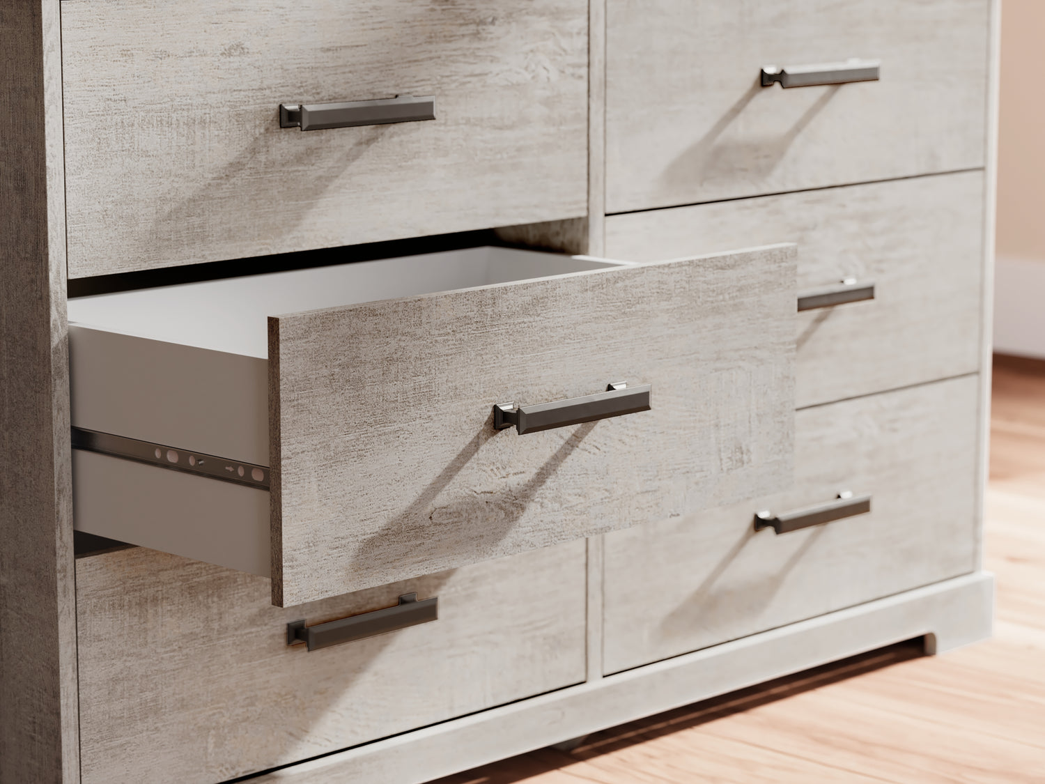 Give casual a new meaning with the chic look of this bedroom package. A light gray finish over replicated oak grain keeps it laid-back and inviting, while substantial pulls in a warm pewter tone add a modern farmhouse touch. The set’s simple silhouettes add a delightfully relaxed vibe to your inner sanctum.