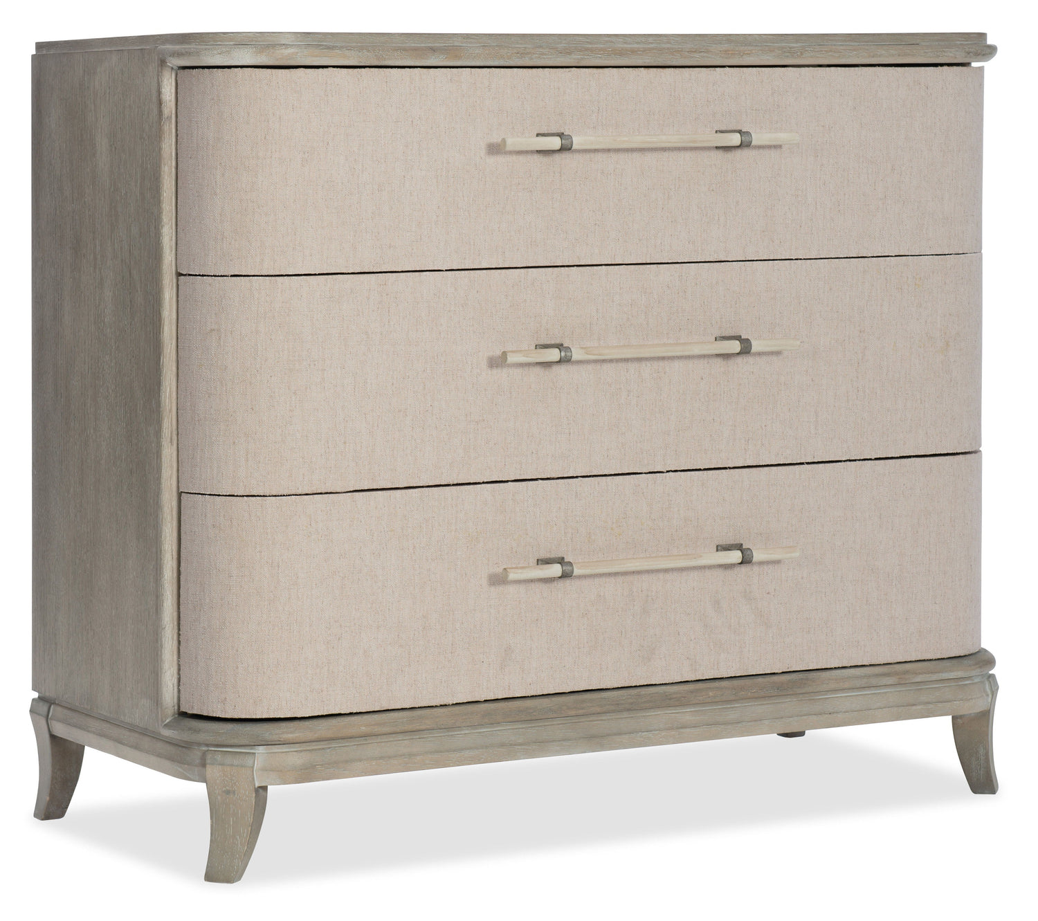 Soft, rounded forms combine with sand-blasted greige and antique white finishes to create an inviting transitional boutique collection in Affinity. The main finish for the 20-piece collection of bedroom, dining room, occasional, accents and home entertainment is a wire-brushed greige (gray/beige) on quartered white oak. Pewter and antique white hardware and soft linen fabrics add intrigue.