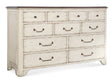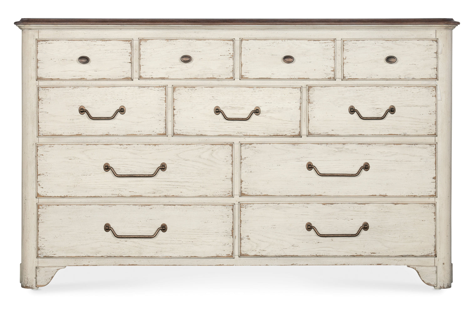 In a two-tone finish with the deep, dark Molasses on the base and the warm Honey on the top, the Americana Dresser is a classic, charming design with a nostalgic flair. There are 11 self-closing drawers, and all 4 top drawers have black removable felt liners. The second left drawer has black removable felt-lined jewelry storage, and the bottom two drawers are cedar-lined. All drawers have the Honey finish inside. Crafted of Oak Veneers with Cedar on the bottom drawers with metal alloy pulls in an antique bronze finish.