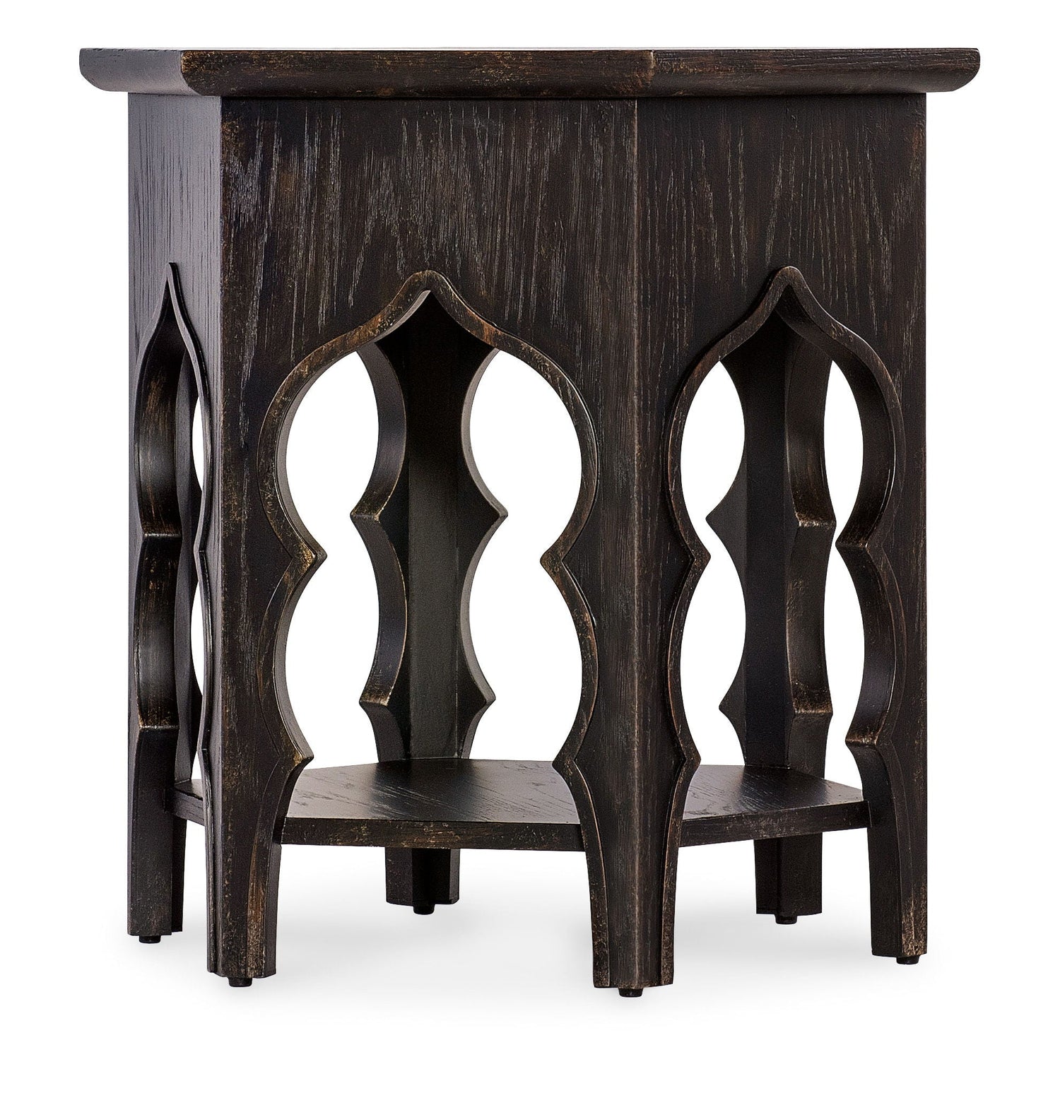 A hexagon shape and carved scalloped legs with arched motifs around the circumference of the Americana End Table exudes the genteel spirit of a simpler time. Crafted of Oak Veneers, it is finished in Molasses, capturing the essence of a well-loved heirloom in a deep dark tone. One fixed shelf.