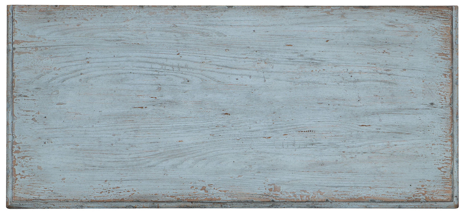 - Finish Description: Skylark: Blue finish with natural wood undertones. Distressing includes rasping, gouging and worm holes.