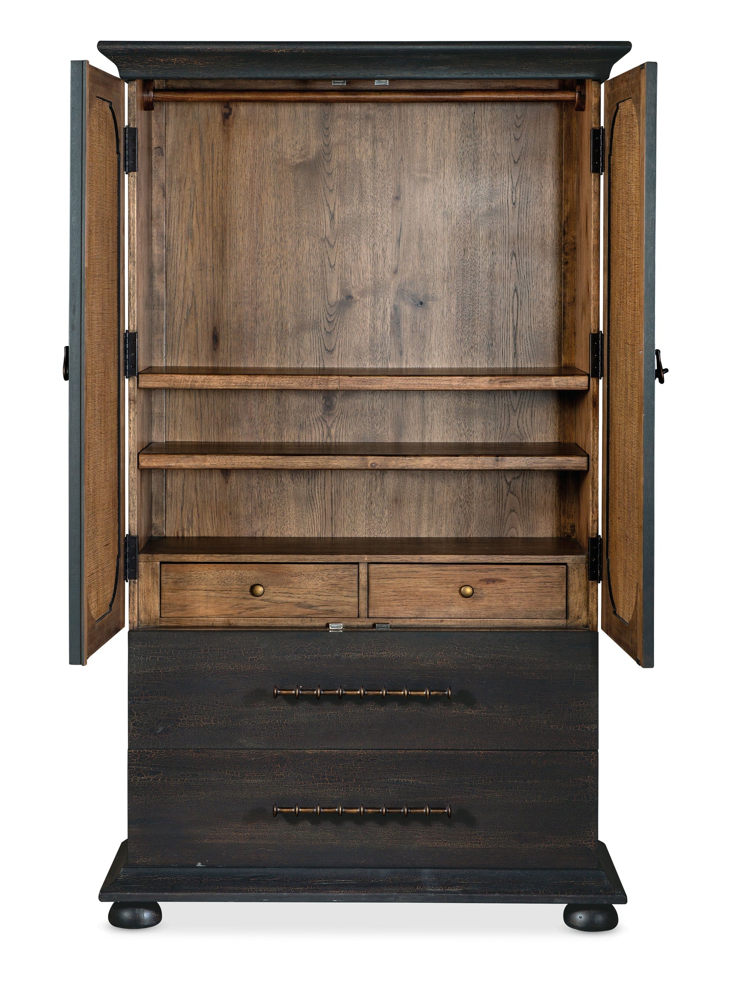 - Charred Timber: inspired by the restorative beauty of a fire-ravaged forest. Distressing includes worm holes, rasping, gauging, plane shock, hand plane, drawknife, wire brush and screw head. Dark brushed bronze bar pulls. Interior is finished in Vintage Natural.