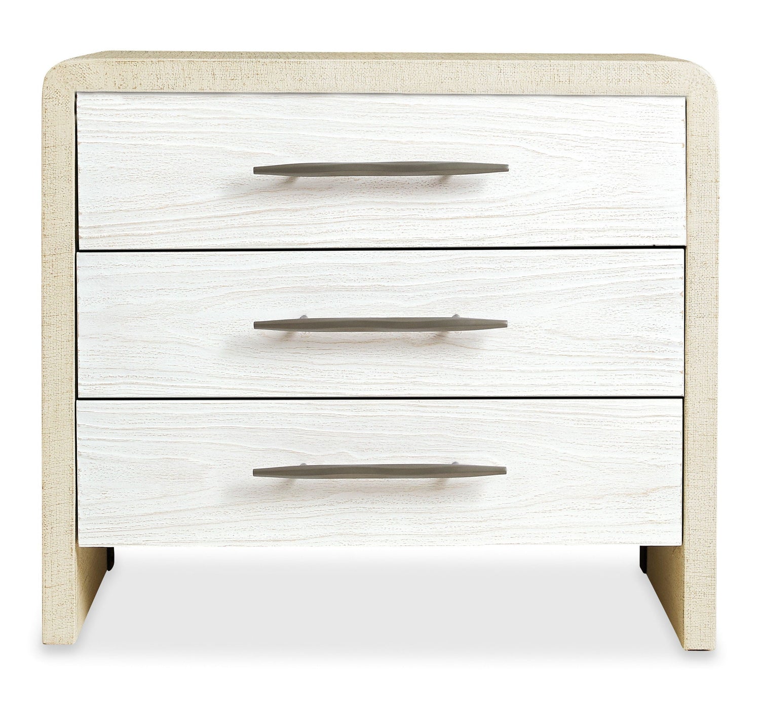 - Outside of case: Pebble Beach: lacquered burlap finish. Drawer fronts: Chalk: cast resin in a soft, white finish. Champagne colored bar pull hardware.