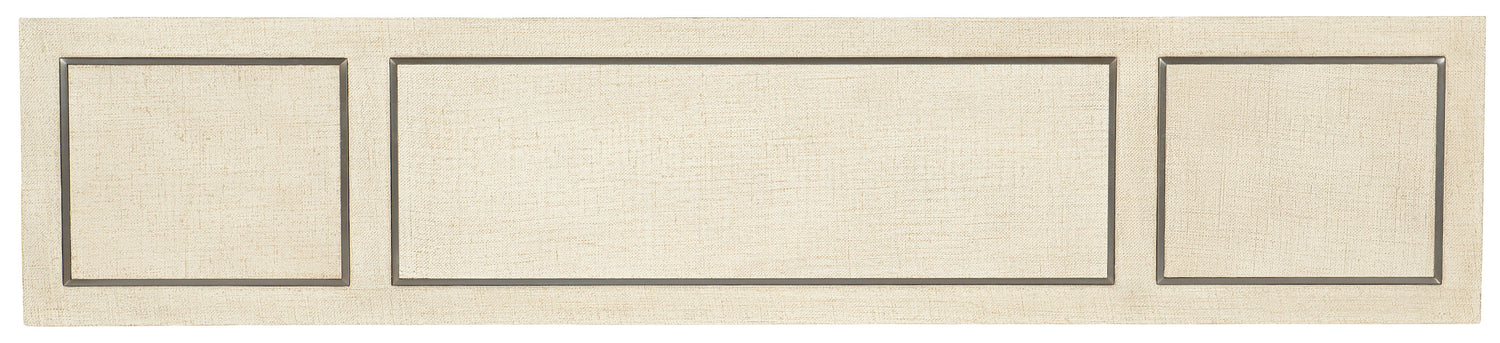 - Finish Description: Pebble Beach: lacquered burlap finish. Champagne colored metal inlay around top, middle shelf and bottom shelf.