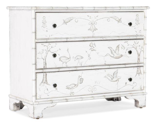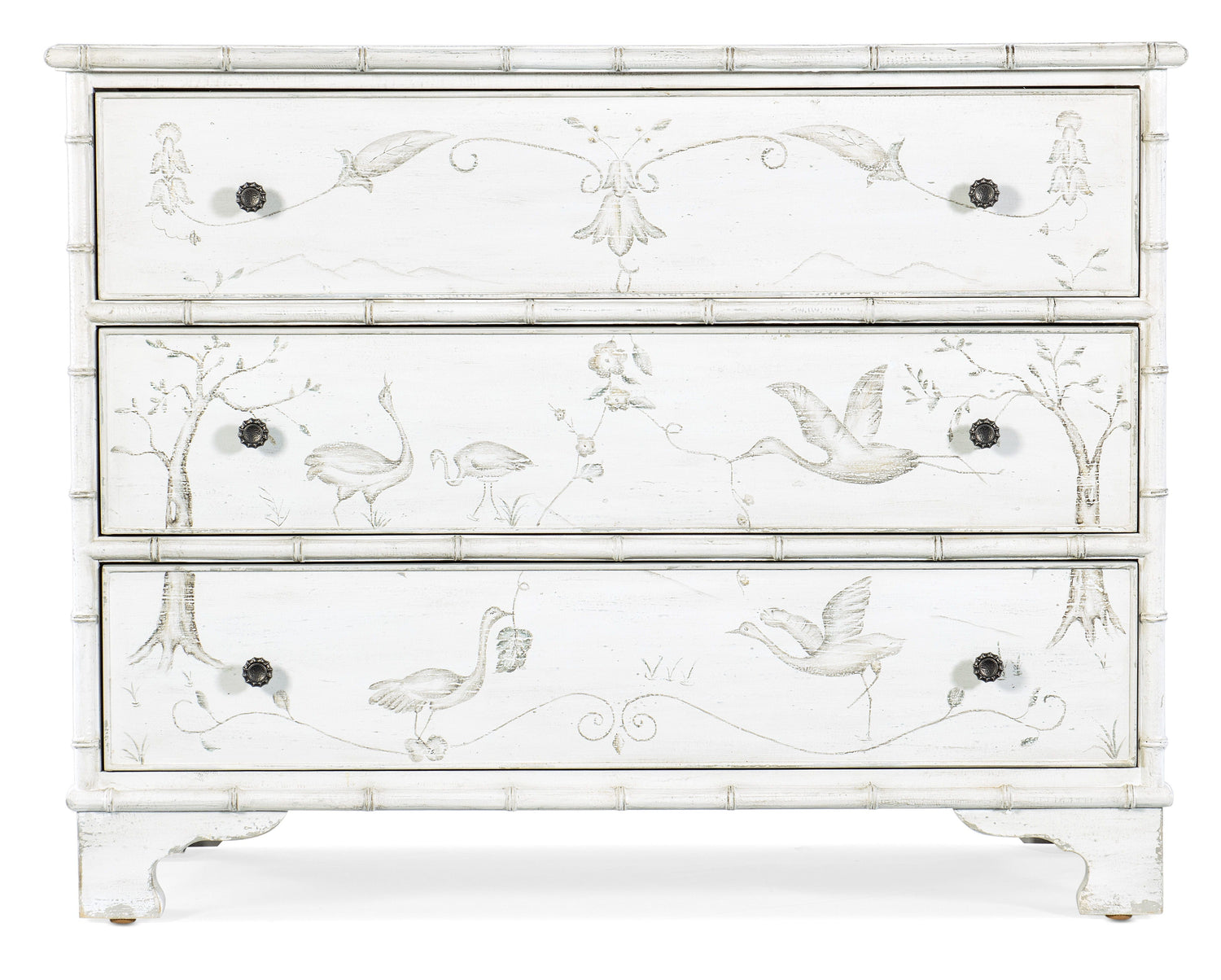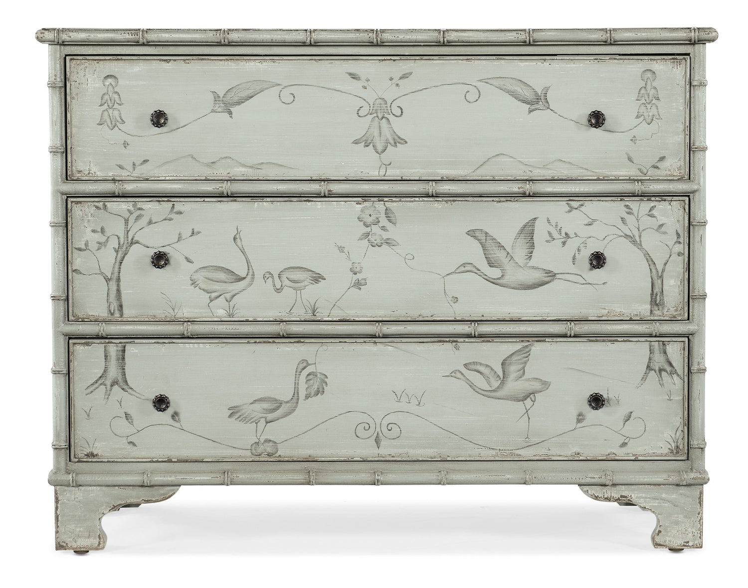Inspired by the tropical craftsmanship of the West Indies and the cane accents of the classic British and Dutch Colonial design periods, the Charleston Three-Drawer Accent chest has bamboo-motif trim and lovely handpainting on the drawer fronts with a Heron and botanical design. The interiors on the 3 self-closing drawers are the same color as the exterior. Crafted in Maple Veneers, the chest is finished in Haint Blue, a soft color which can be found on the ceilings of porches and entryways, window shutters and doors in the American South, dating back more than 200 years from the Gullah folklore that held the color kept “haints” or spirits from entering homes and dwellings. The round knobs are antique bronze-colored.