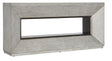 A sleek silhouette is combined with a mix of casual organic materials in the Passage Console. Crafted of Oak Veneers, it has hammered antique brass metal accent on the open area and a plinth base. Measures 74 inches wide by 16 inches deep.