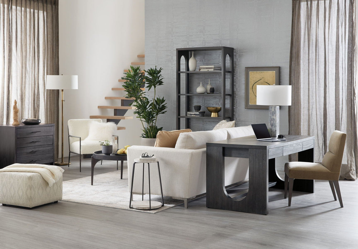 - Drop-front center drawer with wire management cut-out