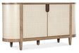 Crisp and current like fashion apparel, the Mélange Arbor Credenza has a two-tone neutral color palette combining Oak Veneers in a medium wood finish on the frame, top and legs with a contrasting canvas crackle in a parchment color on the doors and sides. The two doors have soft-close hinges and magnetic door catches. One adjustable shelf behind the doors.