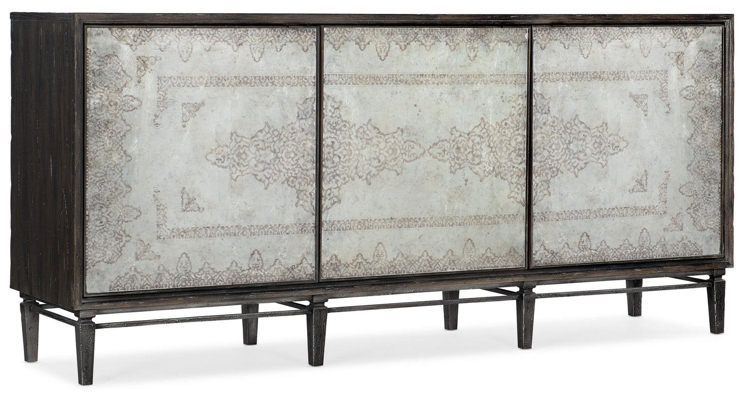 - Finish Description: Dark wood finish with hand painted eglomise door fronts. Pewter colored metal tab pulls. Distressing includes rasping, chopping and gouging.