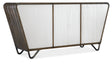 In a swanky inverted quadrangle shape, the casual modern Terra Credenza combines Pine Veneers with metal. The outside and top of the case has a dark wood finish, contrasting with white painted doors and a metal base. The three doors have soft-close hinges and magnetic door catches, with one adjustable shelf behind each door. There’s a ventilated back panel and 3-plug electrical outlet located behind the center door, making this credenza media-friendly. Rounded corners.