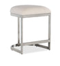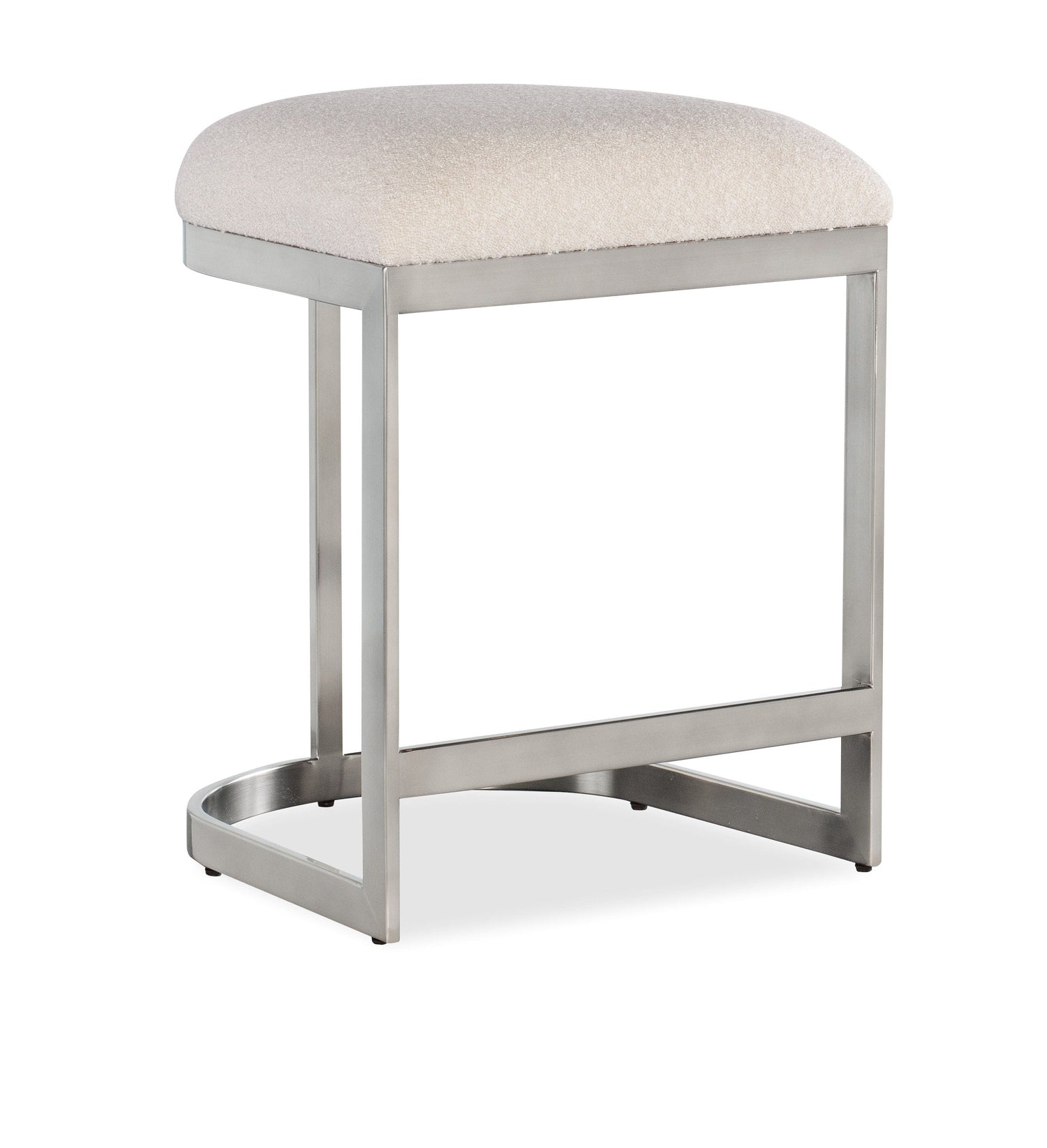Cozy chic meets sleek sophistication with the Modern Mood Counter Stool in a backless design. The tactile and textural Boucle fabric in Inverness Natural on the U-shaped upholstered seat contrasts with a brushed metal base, stretcher and foot rail in a warm pewter finish. Fully upholstered seat.